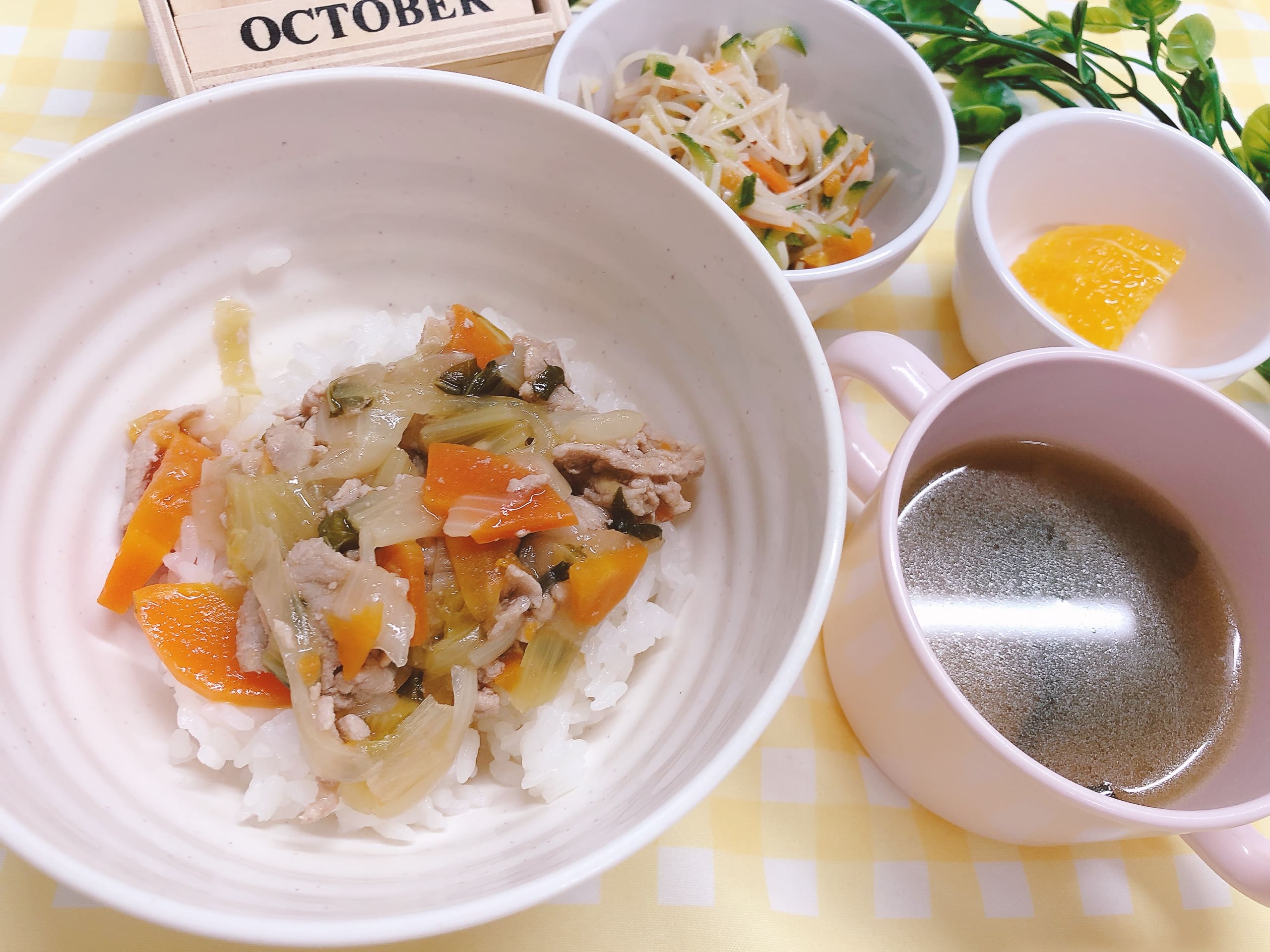 白菜、人参、小松菜をたっぷり使った具だくさんの中華丼。豚肉と野菜を炒めて、やさしいとろみのあんをまとわせました。寒い日にぴったりの温かさとまろやかな旨みで、子どもたちは「おいしい!」と言いながらもくもくと食べ進め、「また作ってね!」の声も上がりました。