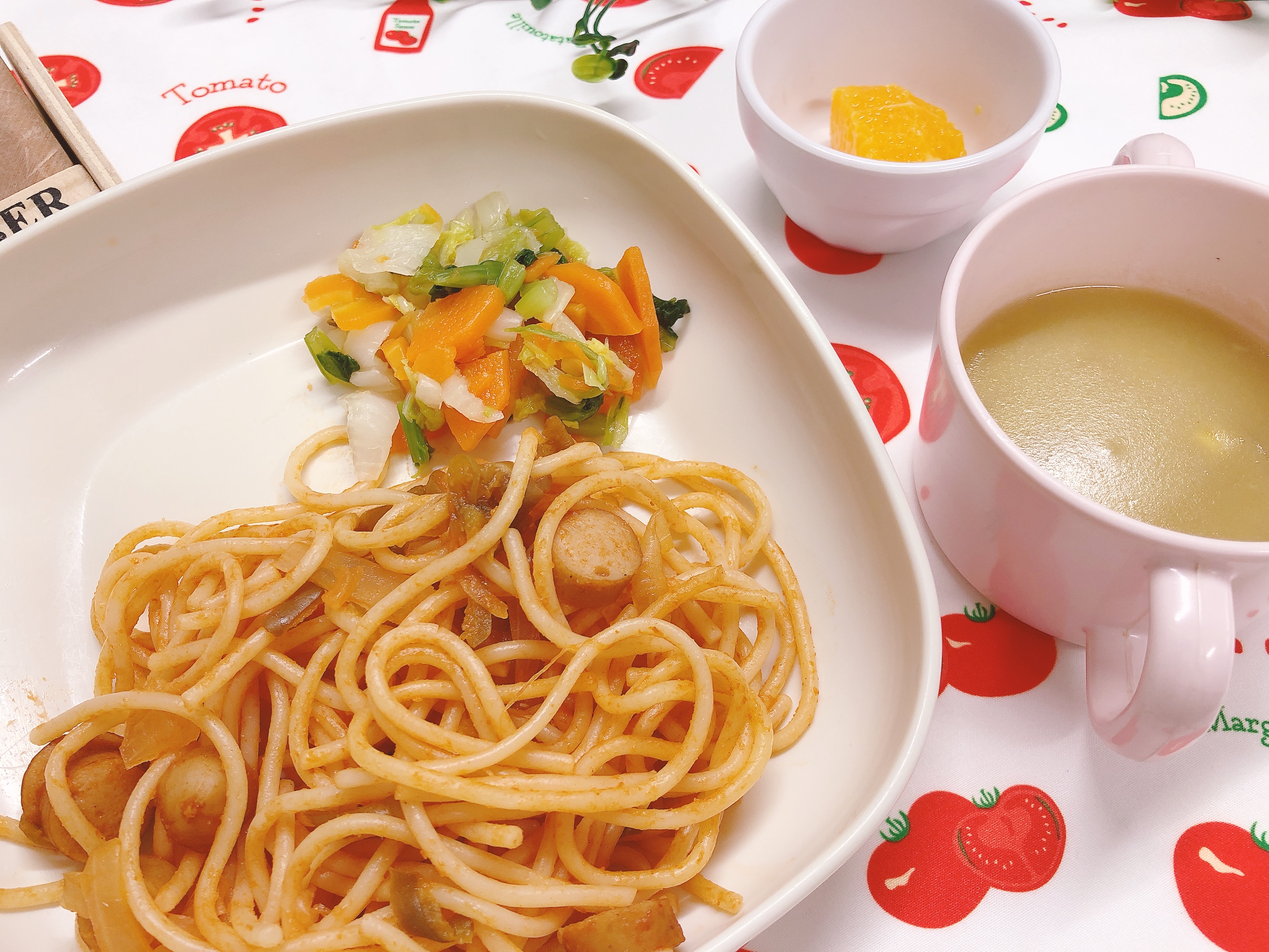 【メニュー名】ナポリタン、コーンスープ、フレンチサラダ、オレンジ
