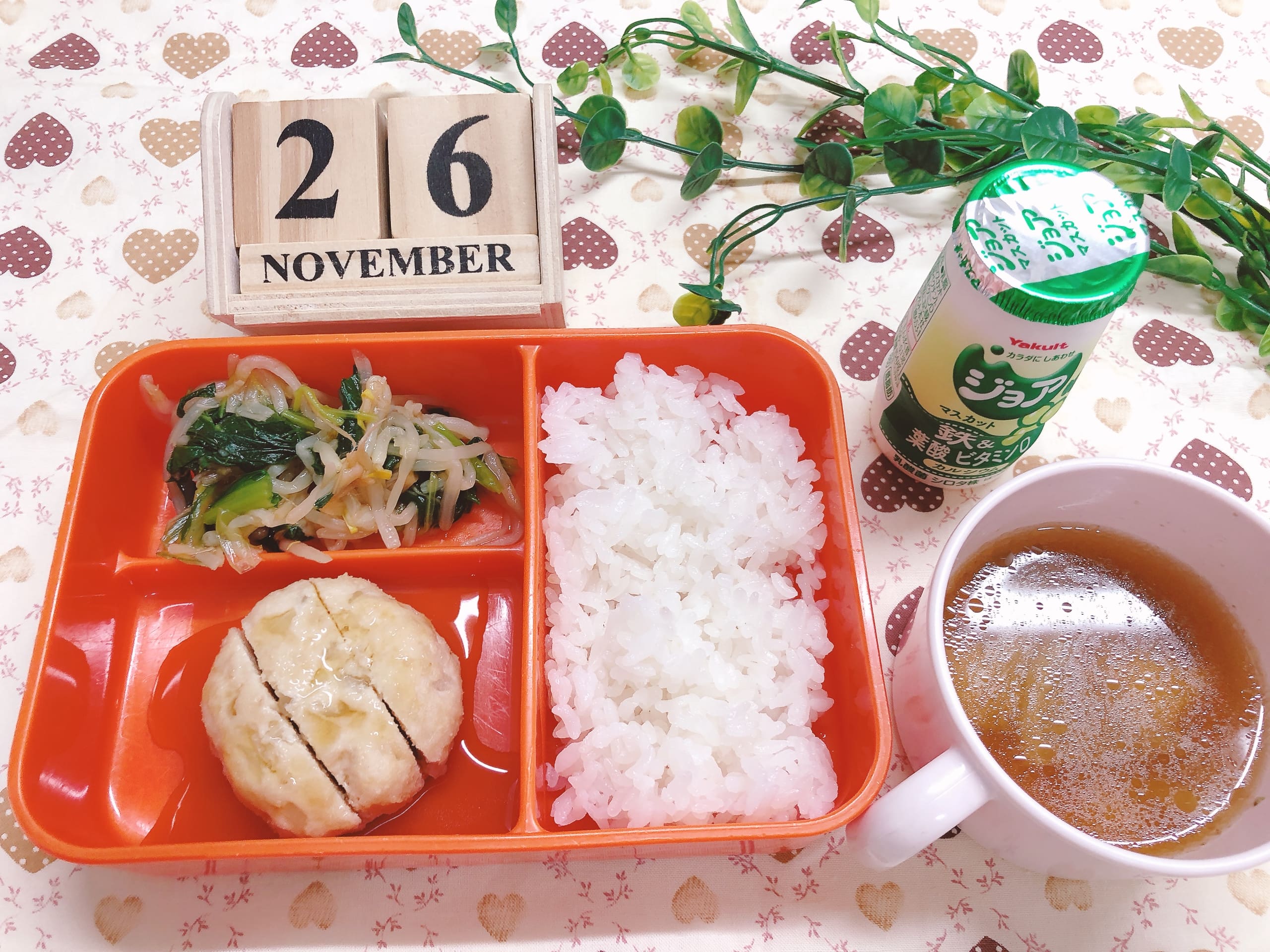 メニュー名:ご飯、根菜の味噌汁、鶏肉団子、なめたけ和え、ジョア