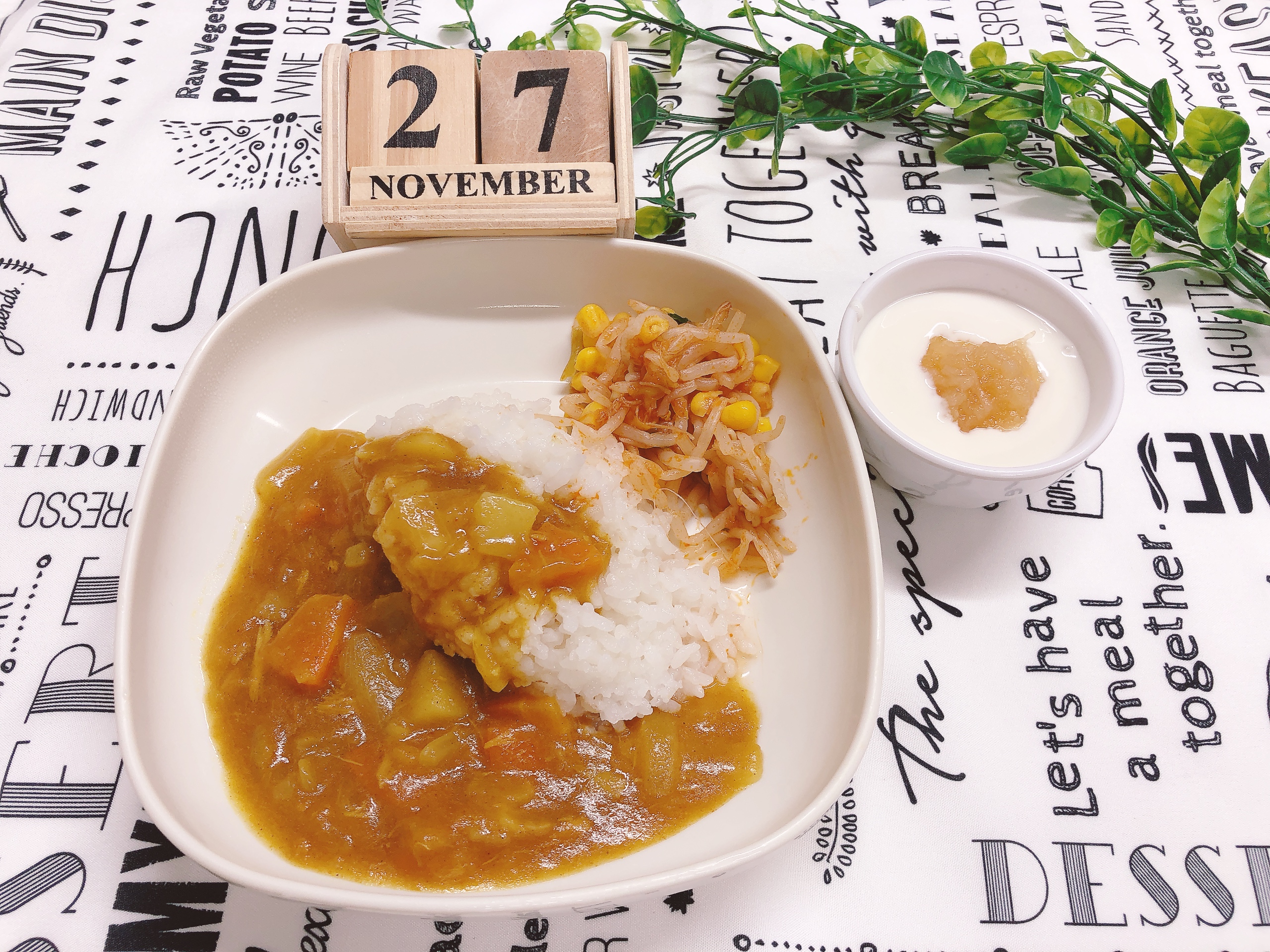 「カレーは大人気!」と先生からの報告があった通り、子どもたちは麦ごはんにたっぷりかけておかわり続出。野菜の甘みが感じられるマイルドな味に、「もっと食べたい!」と元気いっぱい。トマトドレッシングサラダにも挑戦し、「お野菜も頑張って一口食べた」とニコニコで完食する姿が多く見られました。最後のジャムヨーグルトはデザート感覚で、「甘くておいしい!」とあっという間に食べきり、大満足のランチとなりました。