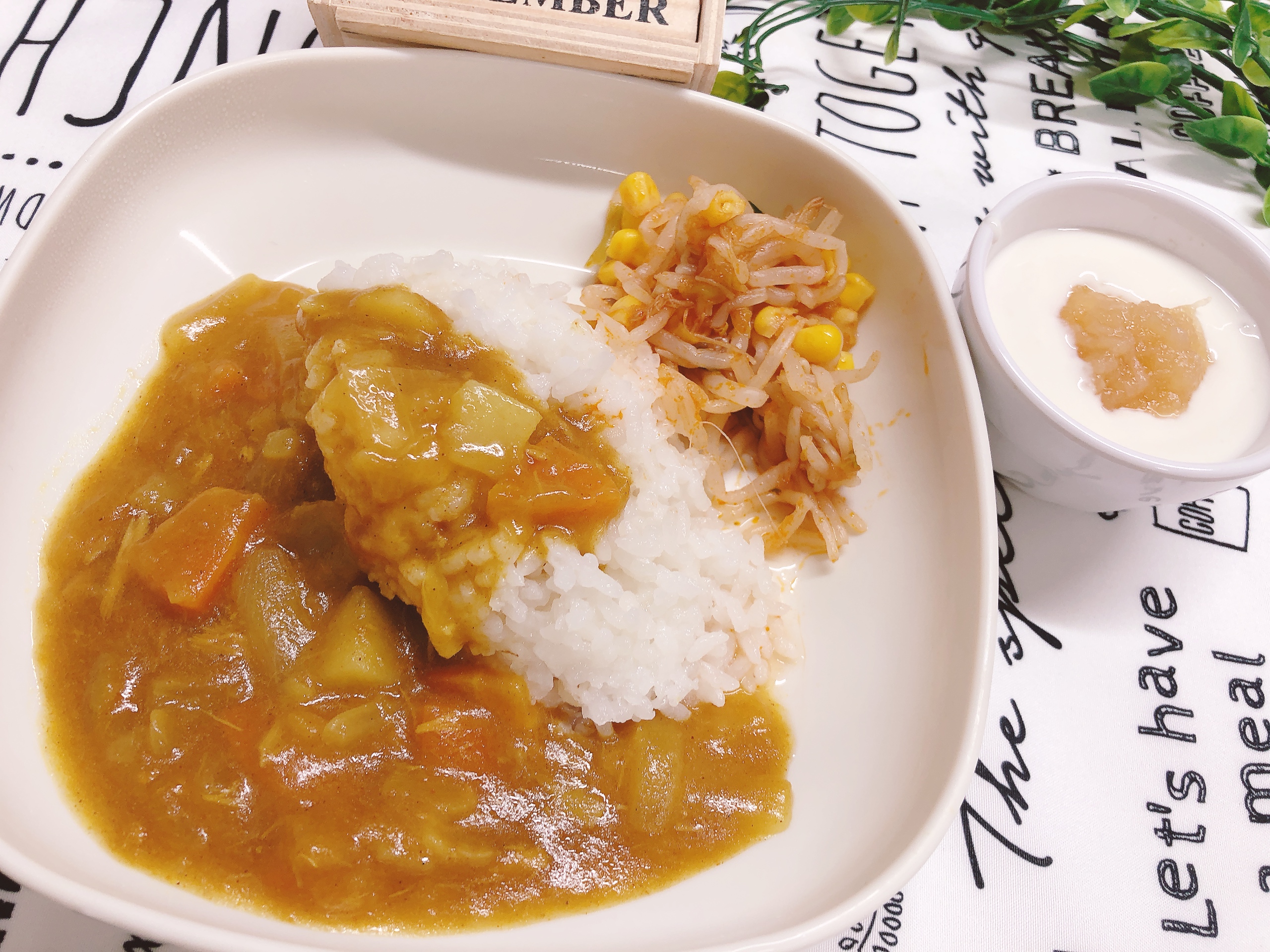 トマトドレッシングサラダは、もやし・小松菜・コーンを彩りよく盛り付け、フレッシュなトマトをベースのドレッシングで和えました。ジャムヨーグルトには、りんごジャムの優しい甘さをプラス。酸味のあるヨーグルトによく合い、子どものおやつ感覚にもぴったりです。