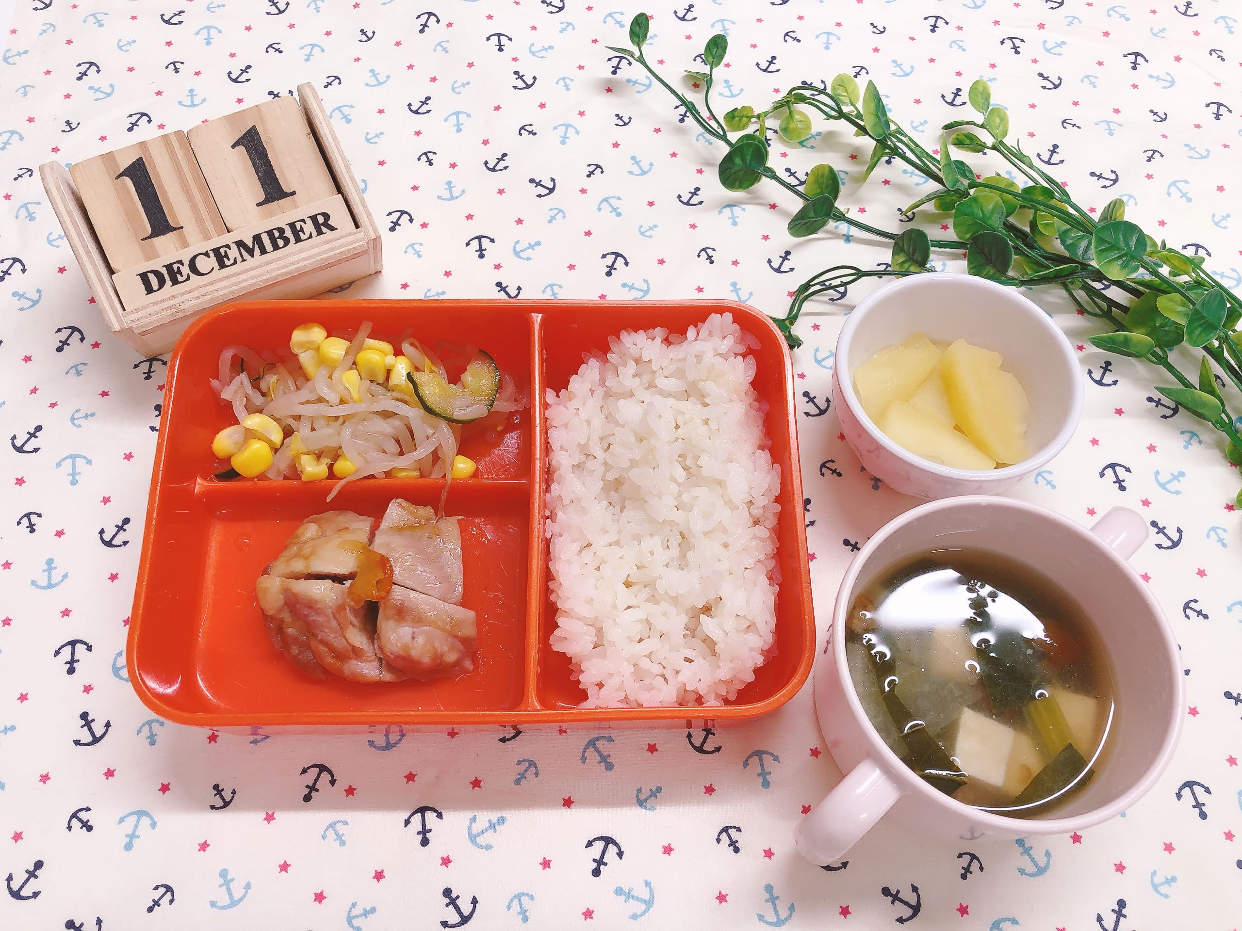 もやし・きゅうり・コーンを細かく切り、食べやすさと彩りを両立。「野菜がカラフル!」と興味を示す子が多く、酢の酸味を熱で飛ばしたドレッシングは酸っぱさ控えめでまろやかな味に調整しました!野菜に挑戦するかっこいい姿が沢山みられました♪