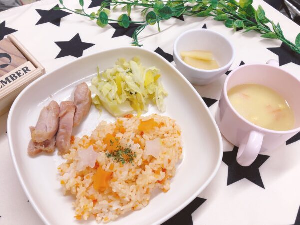 人参を細かく刻み、チキンブイヨンベースでじっくり炒めてから炊きあがったご飯に混ぜ込みました。彩り豊かなオレンジ色と、ご飯にしみ込んだ旨みが絶品です。さらに大根と人参を星形に抜いてトッピングし、子どもたちも「星がいっぱい!」と大喜び!