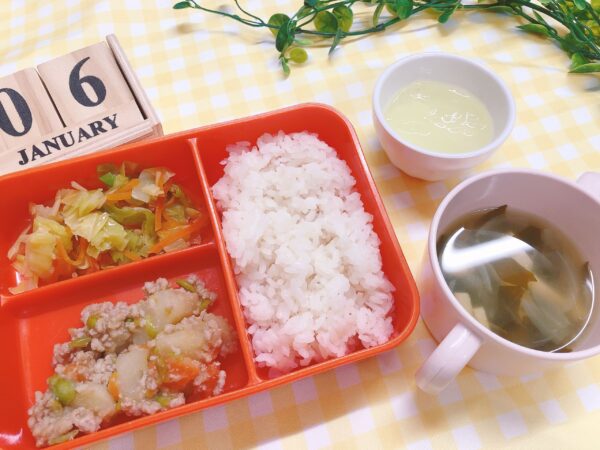 じゃが芋と人参をいったん炒め煮にし、旨味を閉じ込めたあと、豚ひき肉と調味料を加えて再度じっくり煮ました。とろみのあるそぼろあんが野菜にしっかり絡み、「ご飯にかけて食べるとおいしい!」と子どもたちが工夫して食べる姿も見られました。