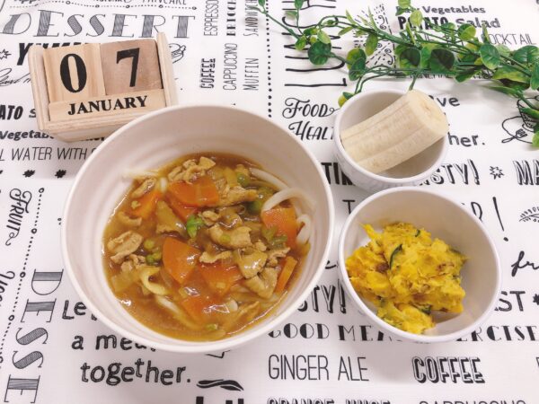 カレーうどんの温かい湯気に目を輝かせ、「もっと食べたい!」とおかわりを求める子が続出。かぼちゃサラダも野菜が苦手な子まで「おいしい!」と手が伸び、ほとんどの子どもがピカピカに完食しました。週の半ばに元気をチャージできた給食タイムとなりました。