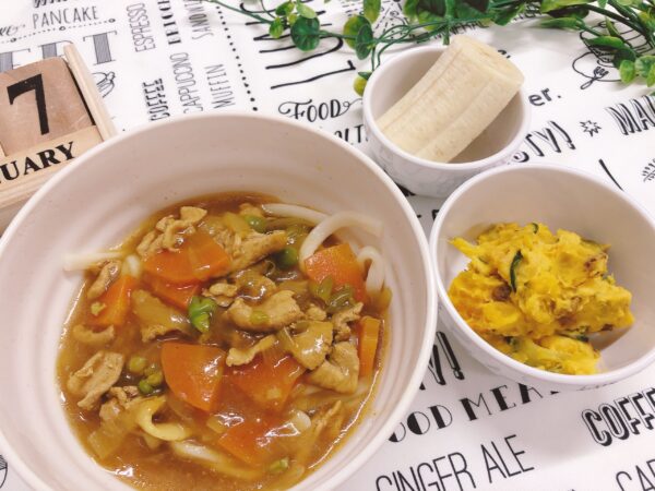 カレーうどんの温かい湯気に目を輝かせ、「もっと食べたい!」とおかわりを求める子が続出。かぼちゃサラダも野菜が苦手な子まで「おいしい!」と手が伸び、ほとんどの子どもがピカピカに完食しました。週の半ばに元気をチャージできた給食タイムとなりました。