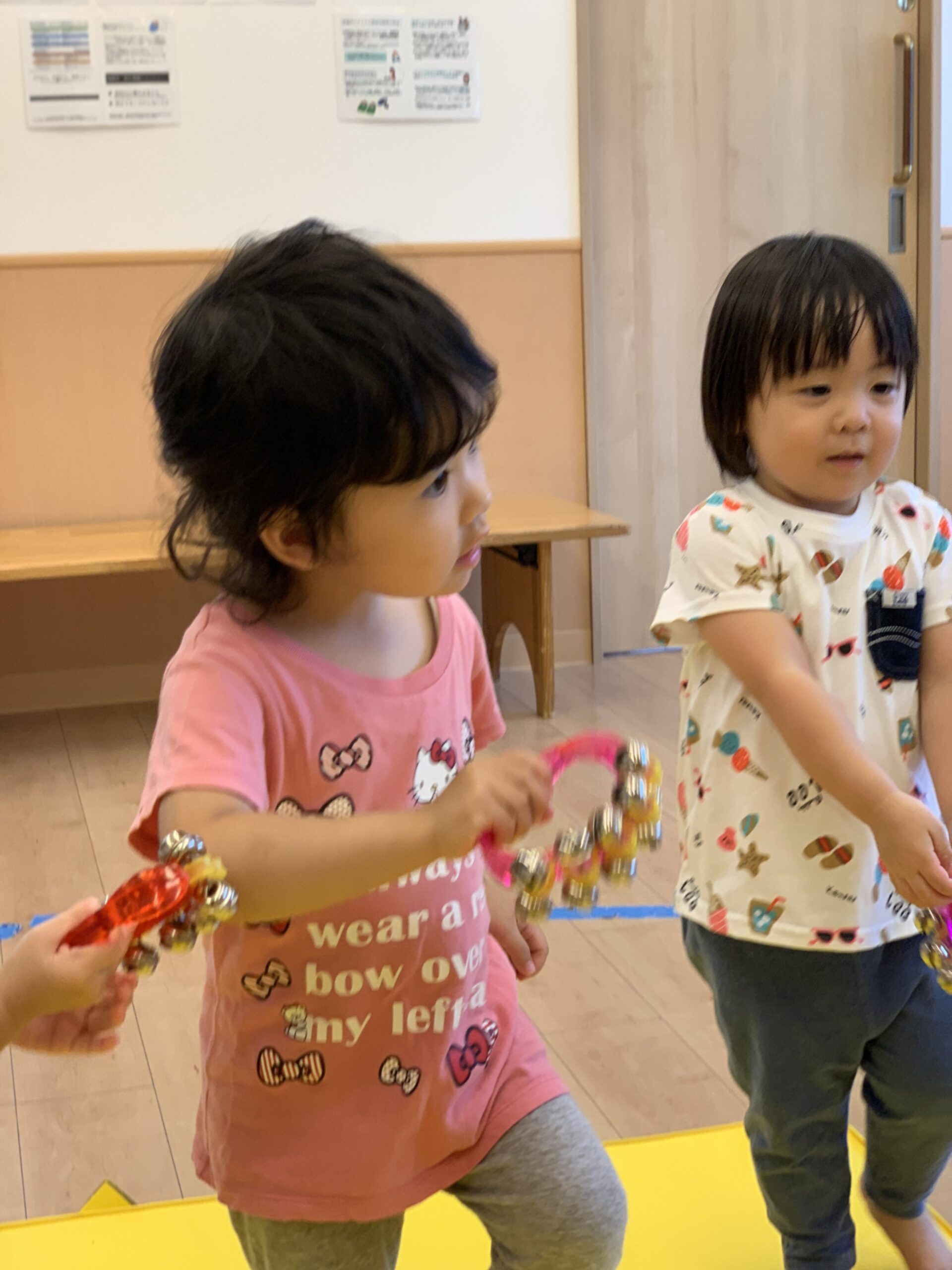 おもちゃのチャチャチャで、トトトンのリズムを意識して鳴らしました。