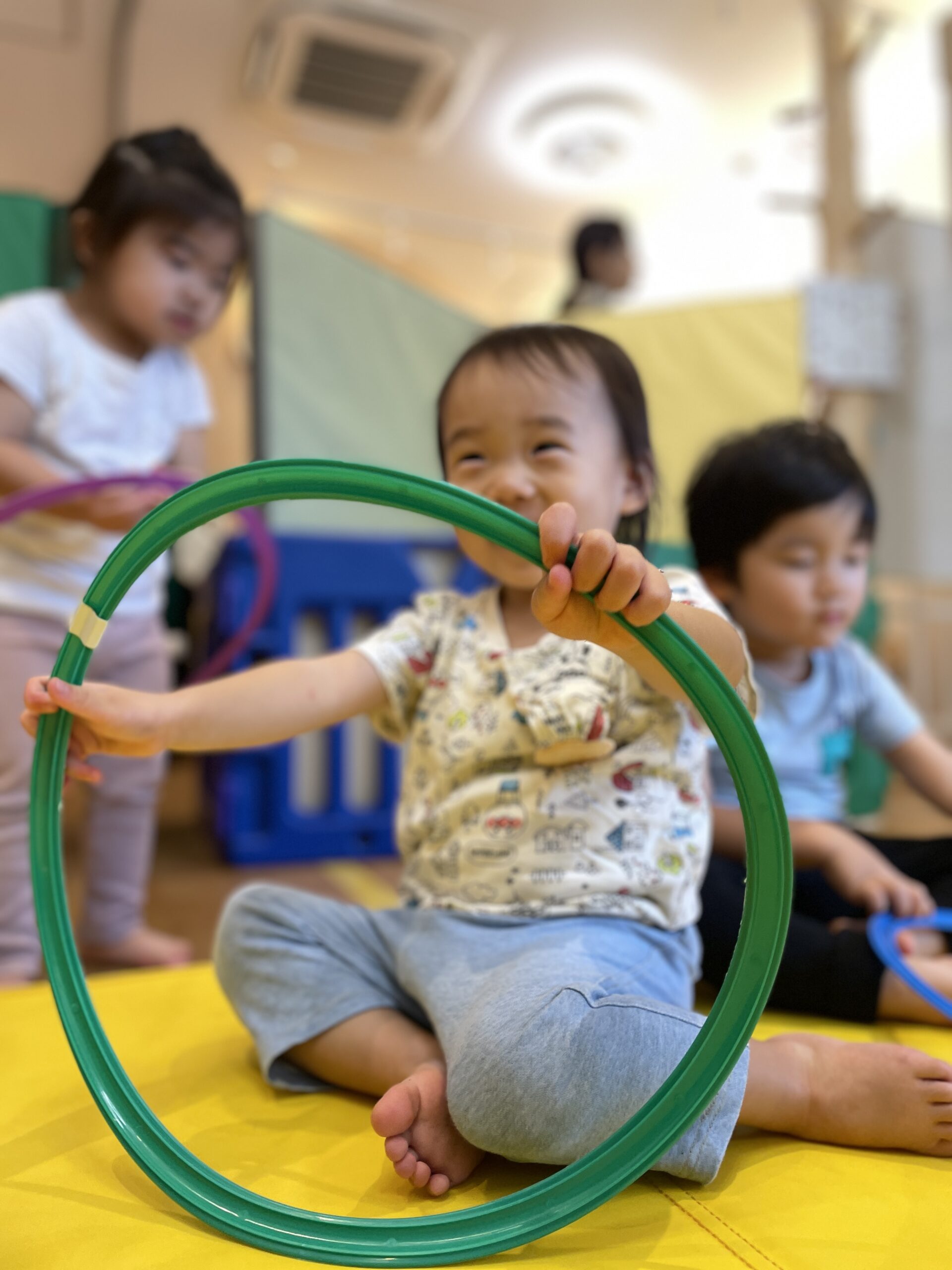 フープをこまのように回し、それを見たみんなが、出来るよ~!と次々にチャレンジする一コマがありました。