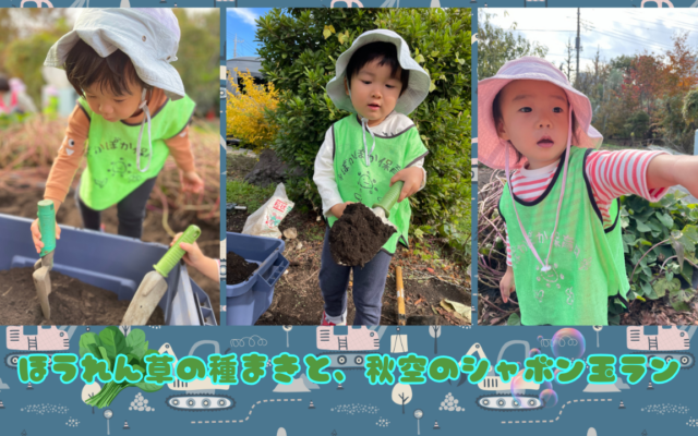 今日は、子どもたちと一緒に、自然を満喫し、晴れた空の下、畑での植物育成と公園での砂遊びを楽しみました!