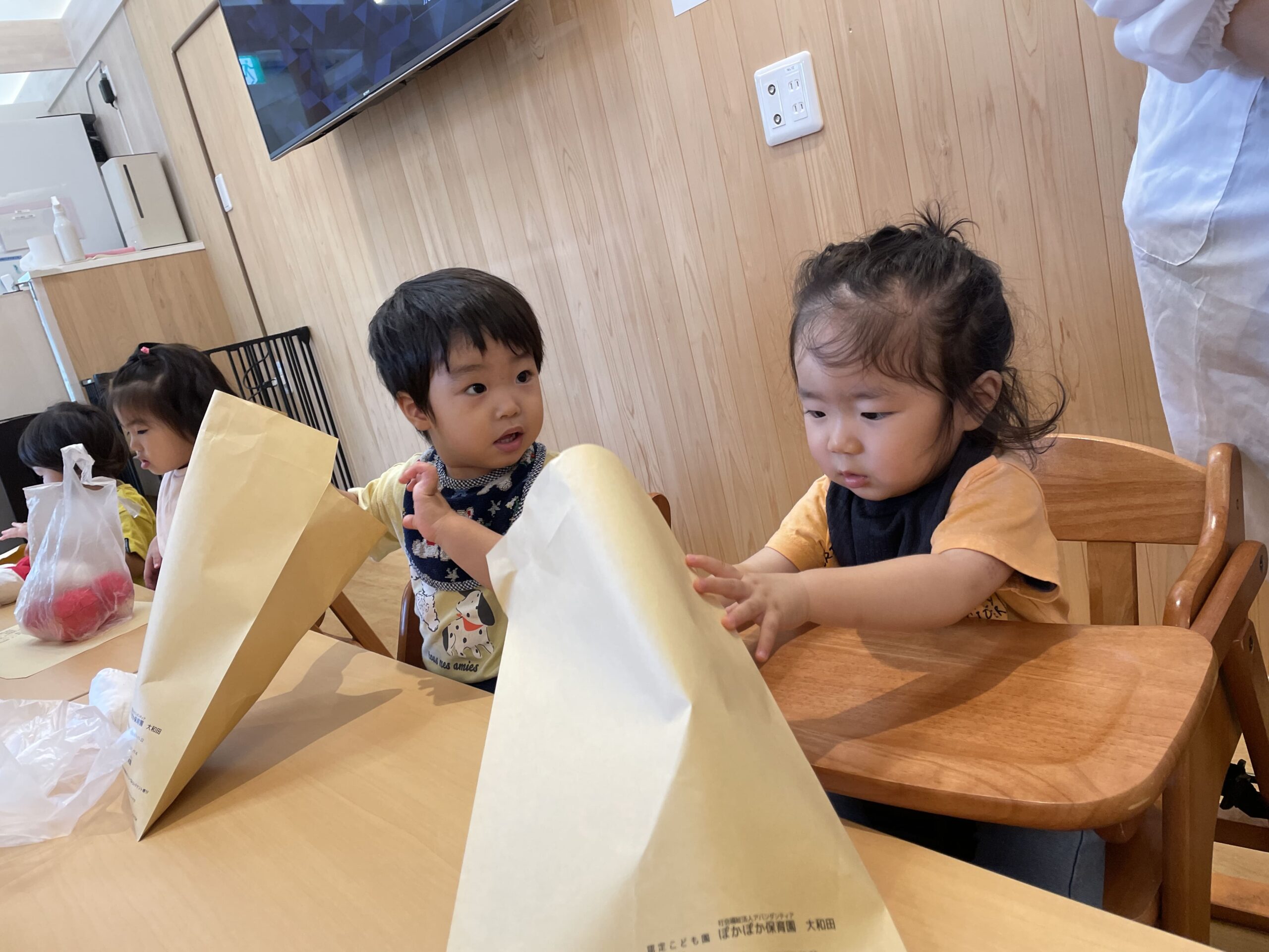 袋を自由に触れられることがうれしくて、手に持って上にあげたり、においを嗅いだり、カサカサ・ガサガサの音に耳を澄ませたりと、物を入れる前から探求心があふれていました。入れること自体が楽しく、何度も出し入れを繰り返し、入れ方を工夫する姿も。紙袋は底を広げるとたくさん入ることに自分で気づいた子、ビニール袋は伸びるから軽い物なら増やせるかも。小さな科学者の表情がきらりと光りました。
