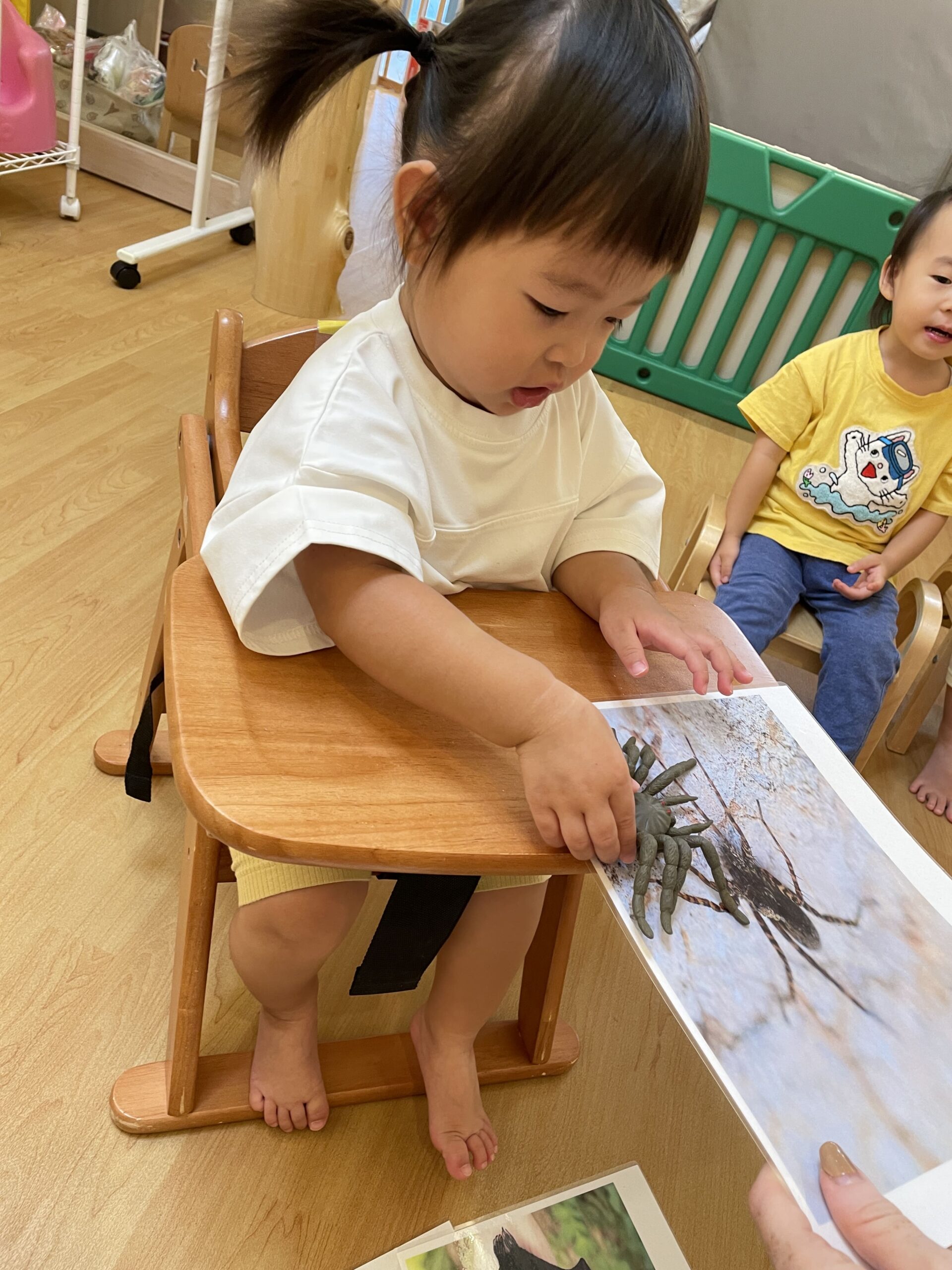 「Yes!Great!」に笑顔がはじけ、1歳も「おなじ!」とまねっこ。0歳は保育者と一緒にカードをタッチして参加します。