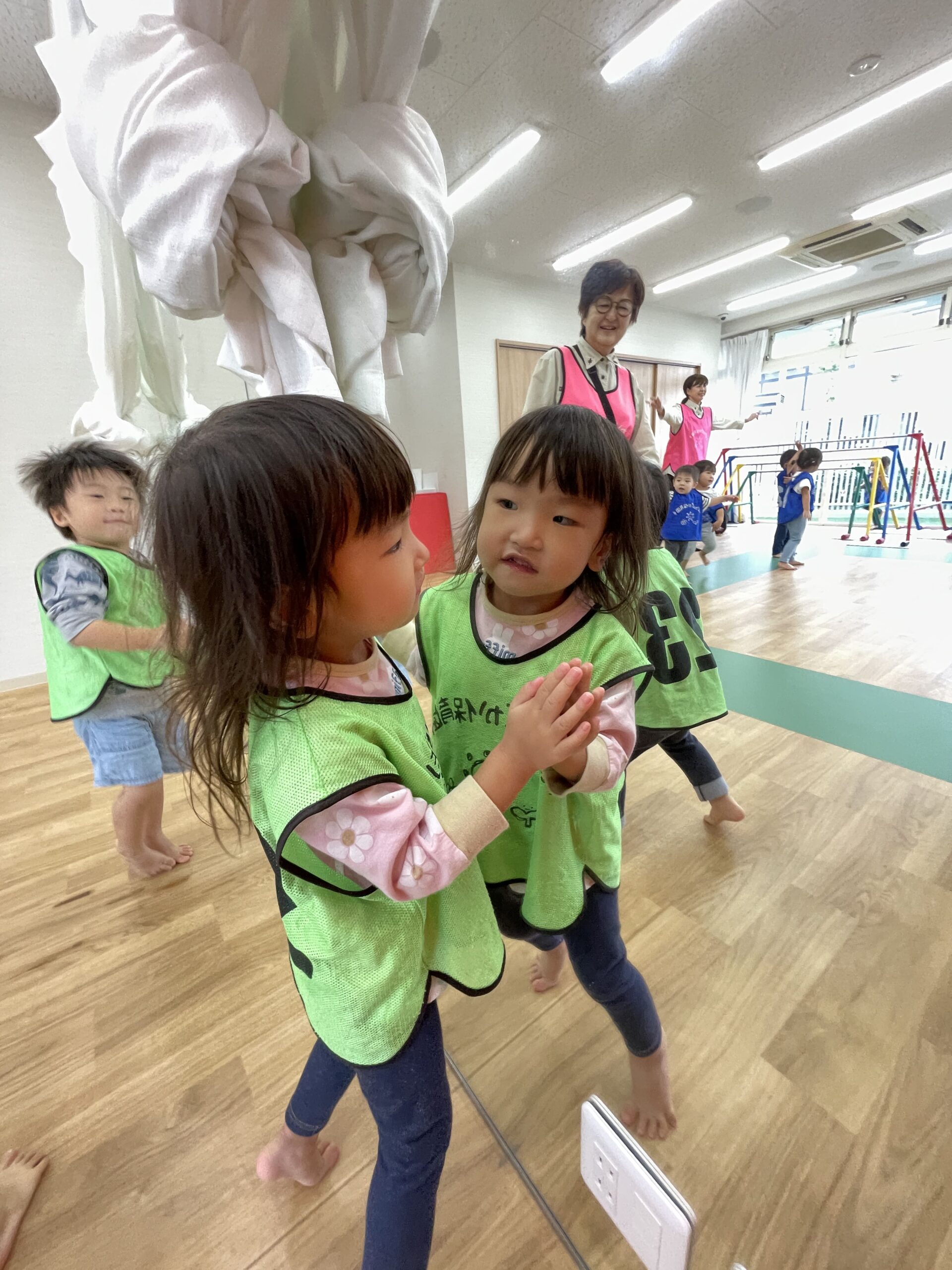 友達の動きをまねっこしたり、「いっしょにしよう」と誘い合ったり、仲良しの輪が広がります。