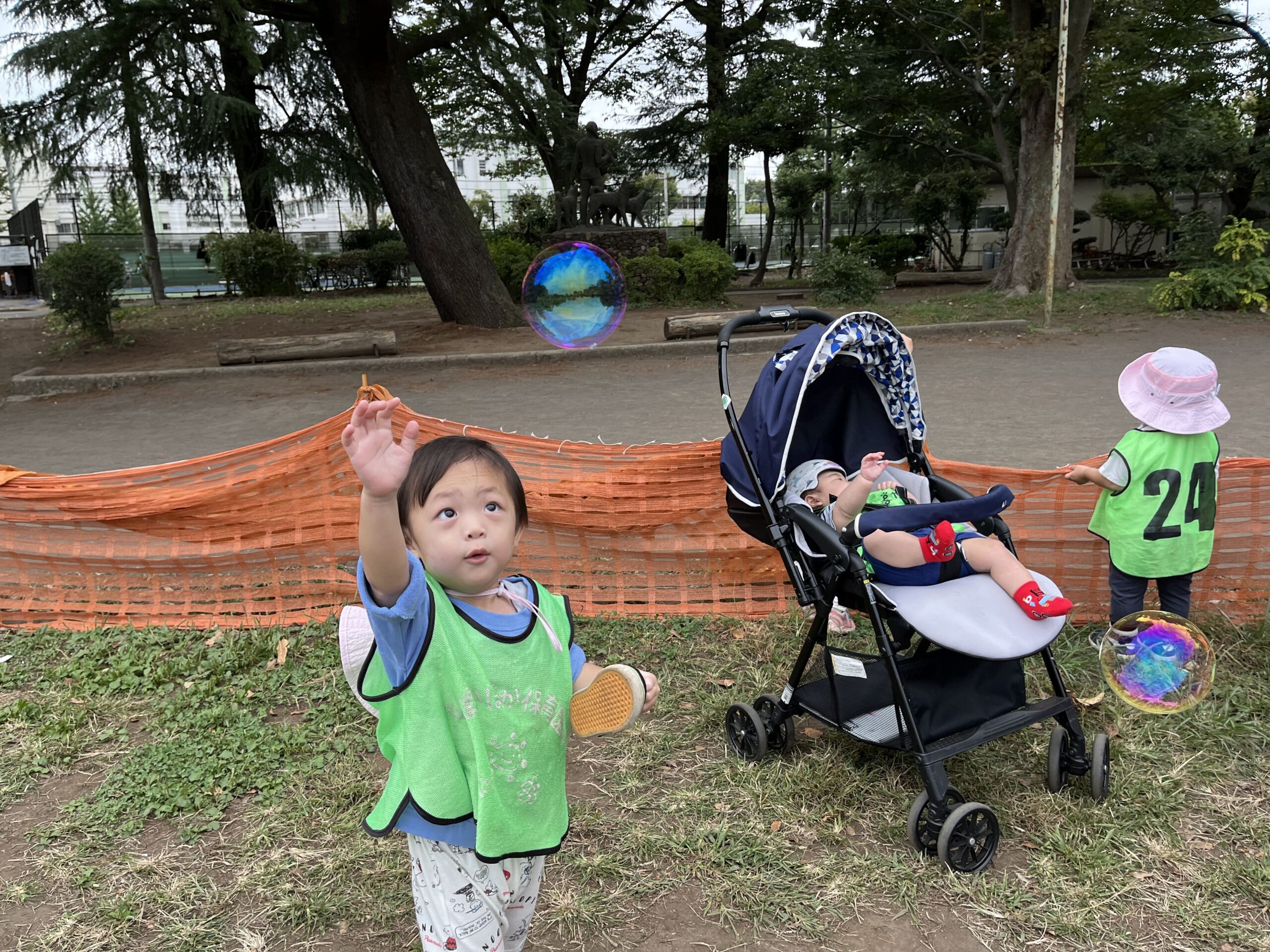 公園では子ども達の大好きなシャボン玉タイム!「ふ〜ってしたら、とぶよ」と先生が吹くと、風に乗ってふわり。