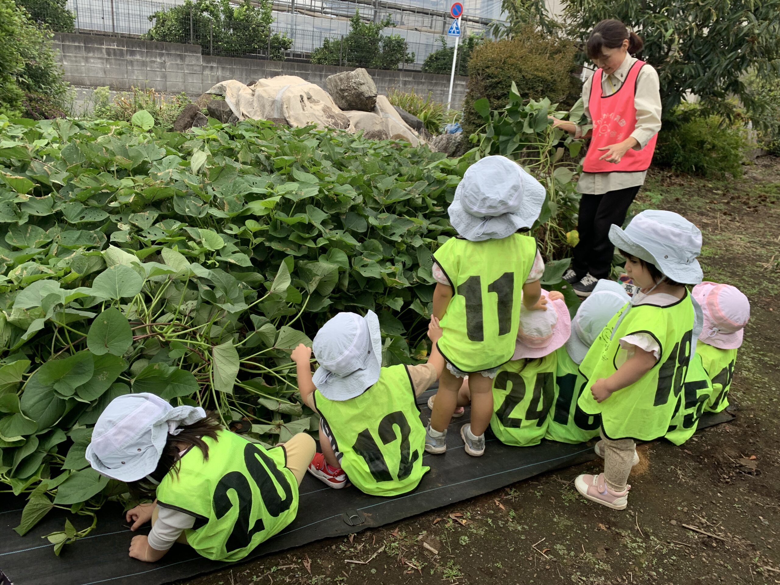 「わー、さつまいも大きくなったかな?」と目を輝かせながら、前に植えたさつまいもの様子を見に行きました。