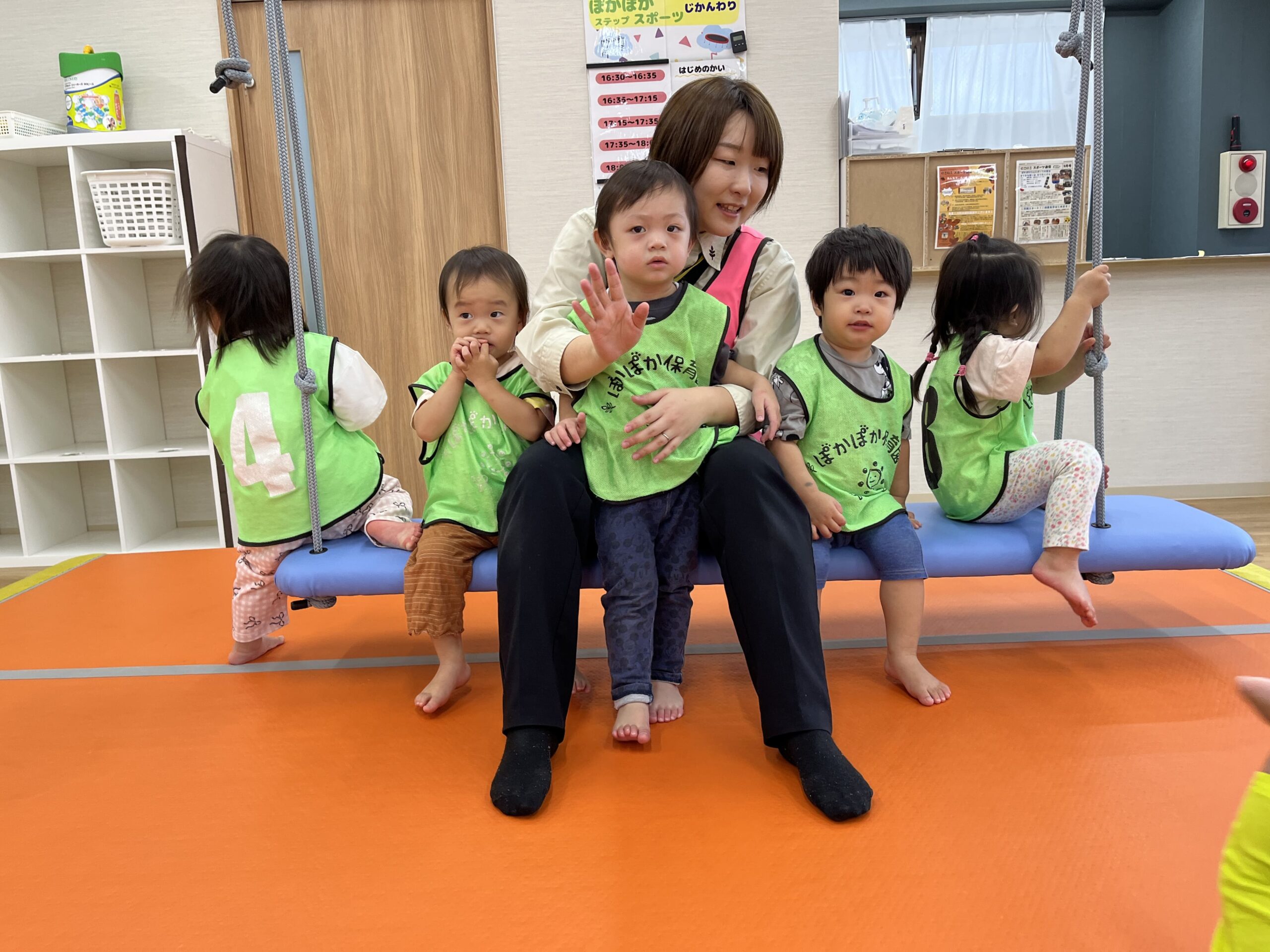 0・1歳さんは先生と一緒に足をつけてゆらゆら、2歳さんは「みてて!」と腕の力を発揮しました。