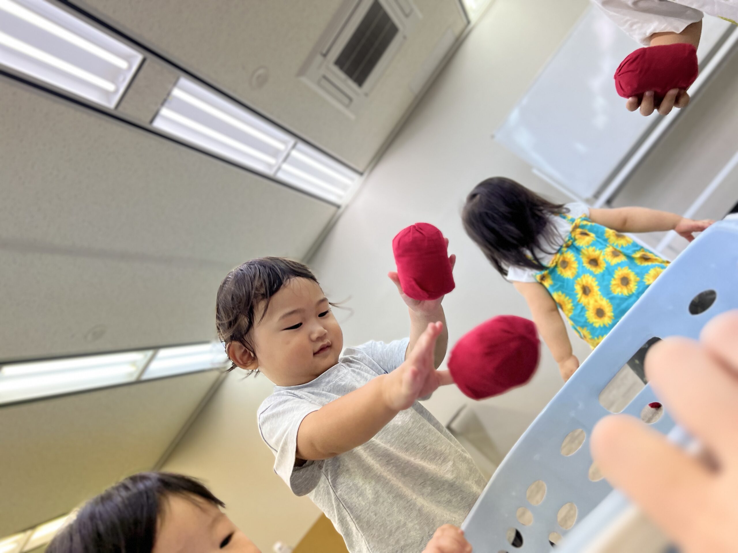 大きなカゴに向かって、みんなでボールを投げ入れました。「もっともっと!」と、次々にボールを拾っては投げる子どもたち!