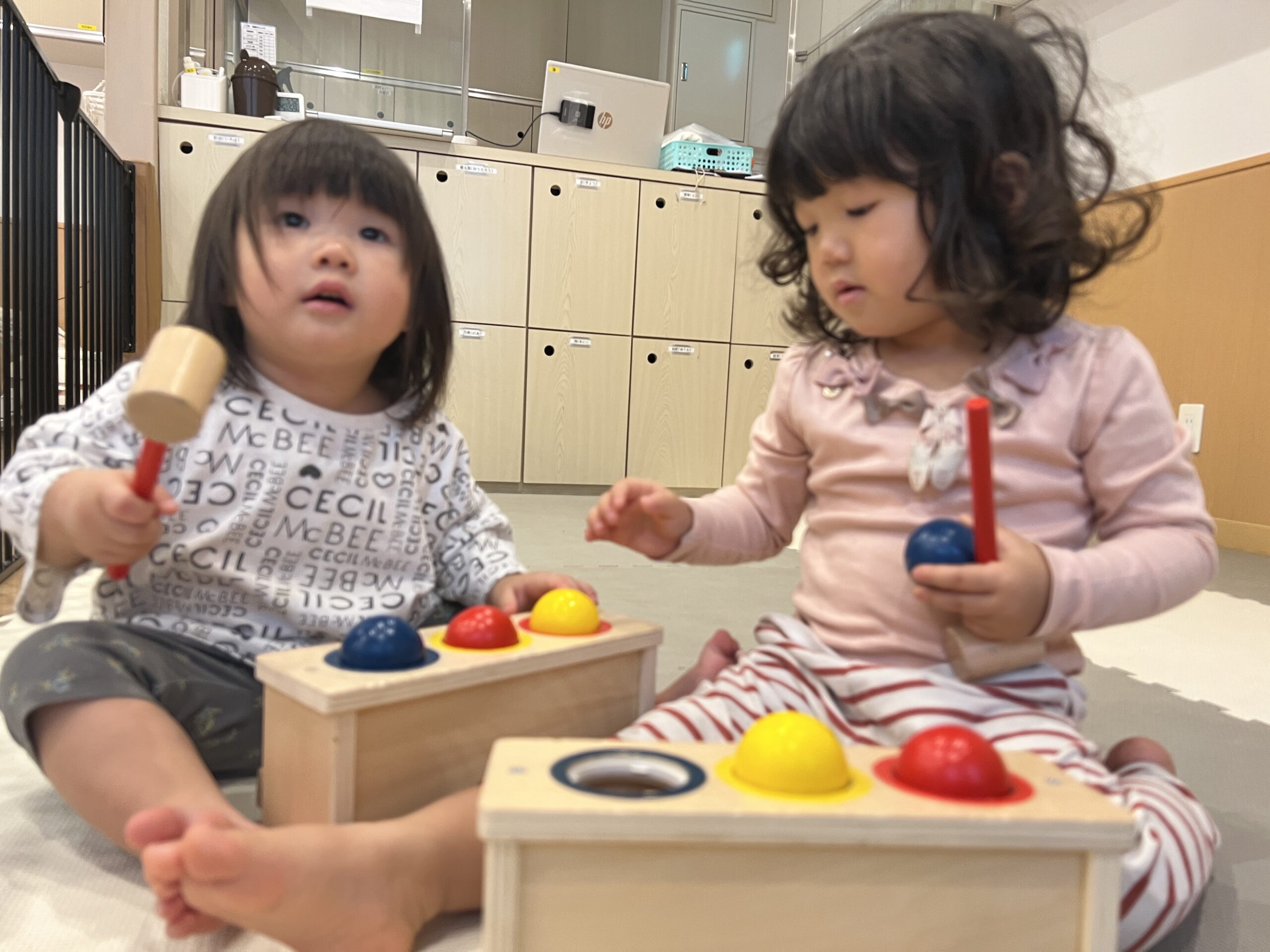 2歳さんはスイスイ、1歳さんも「よいしょ!」と挑戦し、友達を応援する「がんばれー!」。