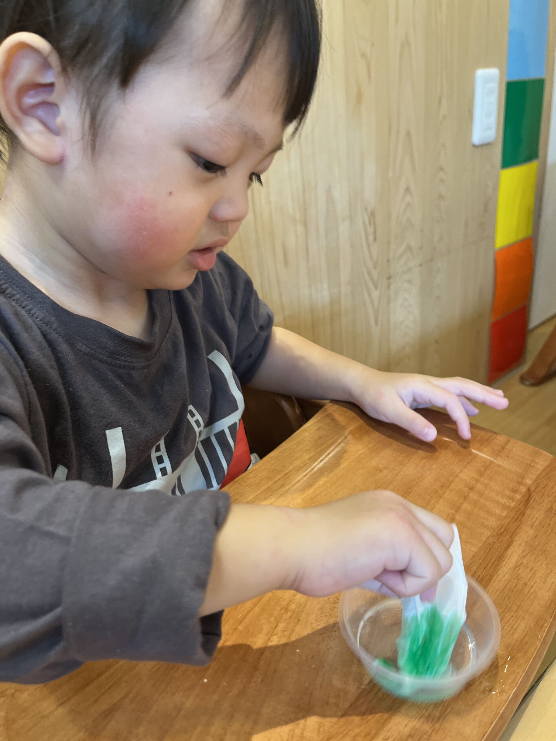 今日は晴れ。保育室ではサイエンス+の時間、0・1・2歳の子どもたちと水性ペンで色を付けたティッシュペーパーを水に浸す実験をしました。