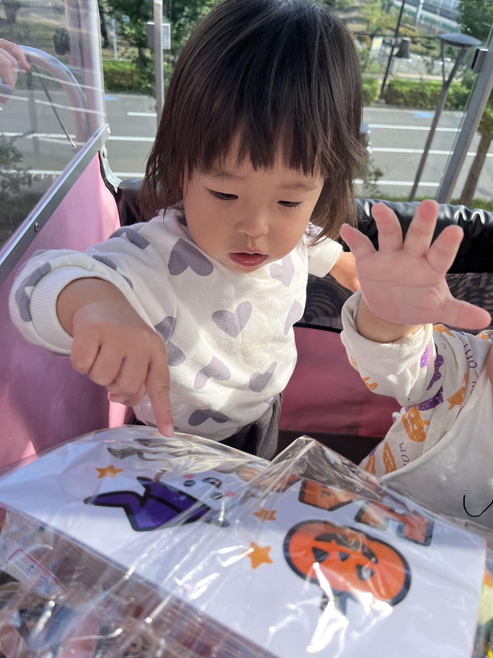 いよいよテナント巡り。「ドアの前で止まって、笑顔でごあいさつだよ」と先生が伝えると、2歳が「ぼく、言うね!」と合図。みんなで「トリックオアトリート!」と声をそろえると「わあ、上手だね!」とお店の方が拍手。0歳は先生と一緒に手を振り、1歳は「ありがとう!」と言えるように練習、2歳は「ぼくたち仲良し!」と胸を張って、嬉しいお菓子を受け取りました。先生が「お礼を忘れないのがかっこいいね」とほめると、子どもの笑顔がさらに大きくなります。