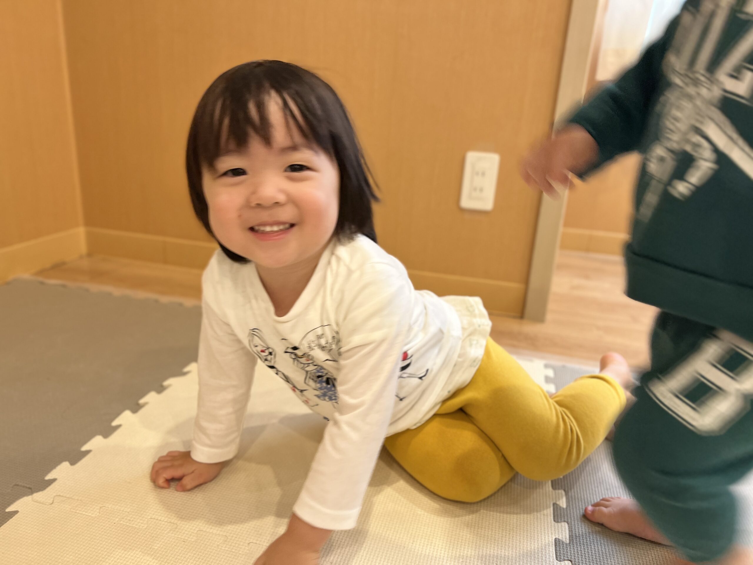1歳さんが一生懸命追いかけ、元気いっぱいに走り回ります。