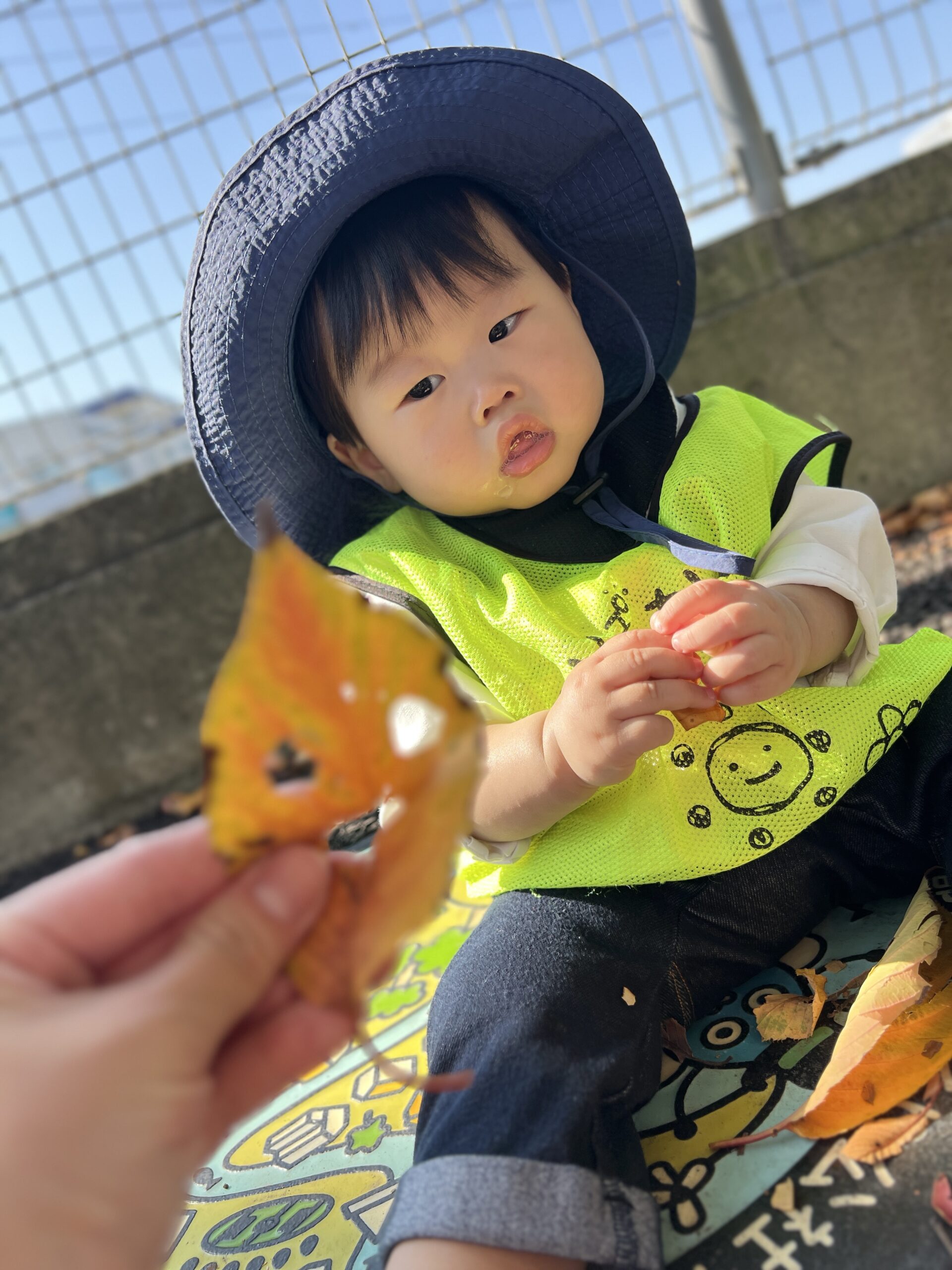 公園では、色づいた木の葉やどんぐり探しに夢中です。