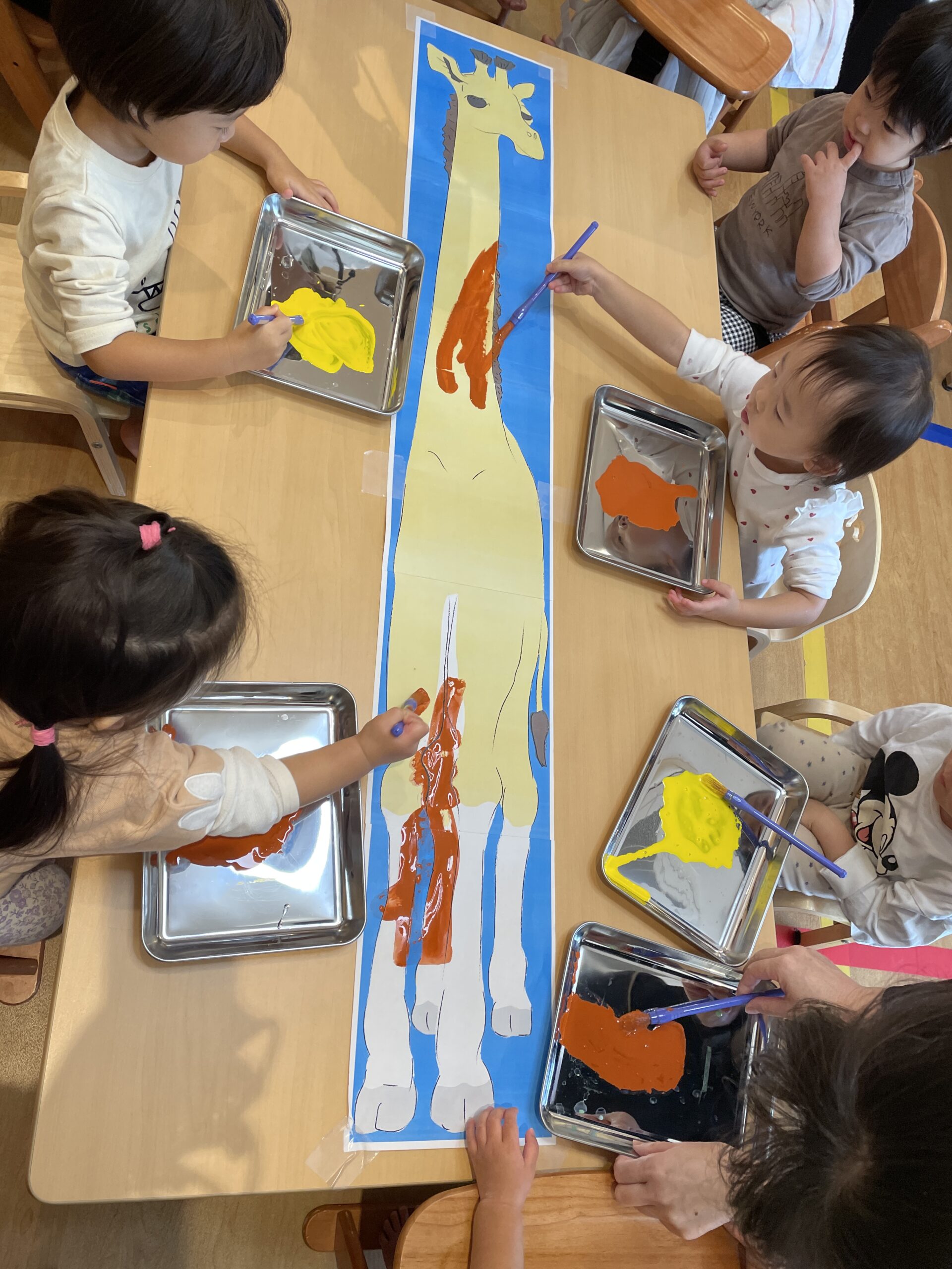 仕上げの時間。「ここ、まだ白いよ」と2歳さんが気づくと、1歳さんが「わたし、ぬる!」とバトン。先生が「交代の『どうぞ』『ありがとう』を言ってくれる?」と促すと、「どうぞ」「ありがとう」と温かいやりとりが生まれます。完成したキリンを見て「おっきい!」「かわいい!」と拍手。小規模保育の落ち着いた環境だからこそ、集中と達成感をじっくり味わえました。