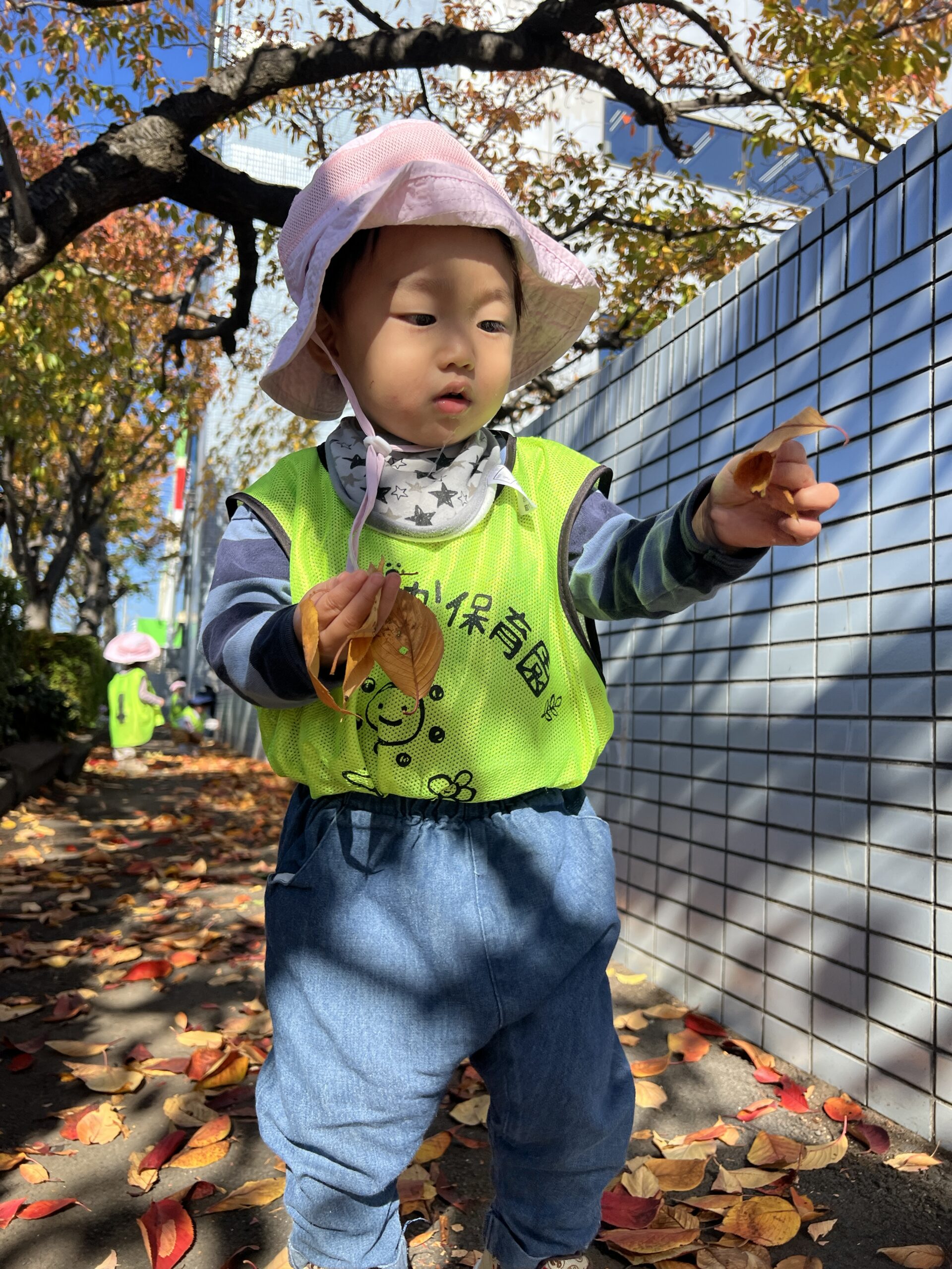 「これどんぐり!」「葉っぱカサカサするね」と手に取ってじっくり観察したり感触を楽しんだりしていました。