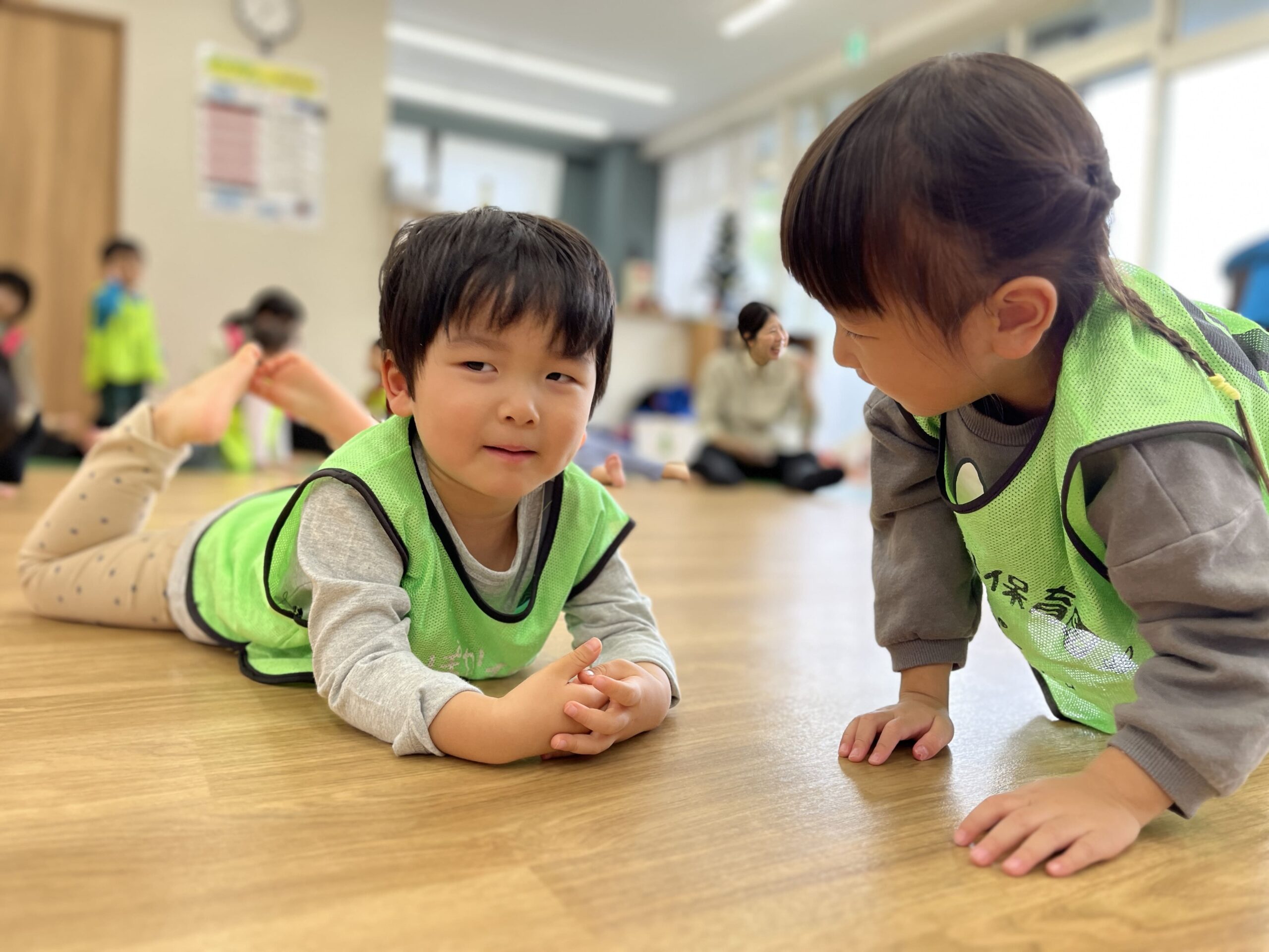 「こうかな?」と一緒に確認。飛行機のポーズも上手にできていました。音楽に合わせたダンスは、幼児教育の視点から体幹・バランス・リズム感・注意の切り替えを育てる活動。ひとりひとりの得意な動きを見つけ、個別対応保育で立ち位置や声かけのタイミングを調整し、成功体験を重ねています。