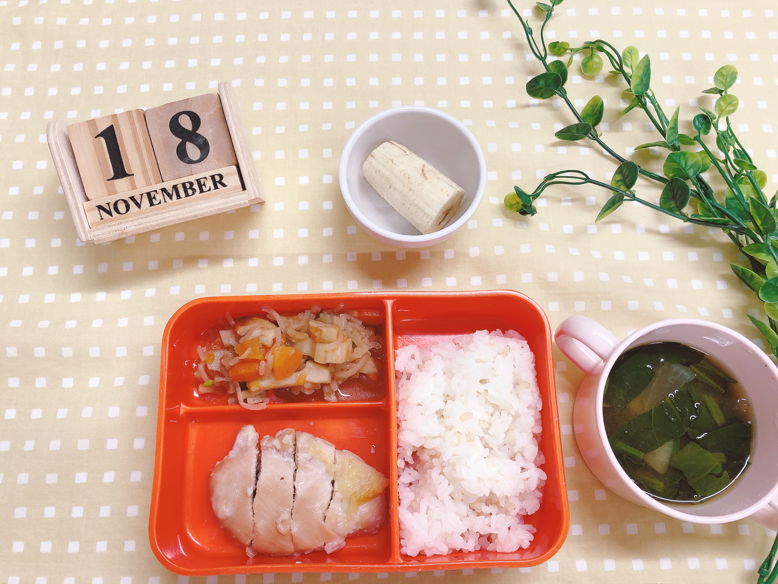 【メニュー名】玄米ご飯、味噌汁、鶏肉の塩こうじ焼き、れんこんのきんぴら、バナナ