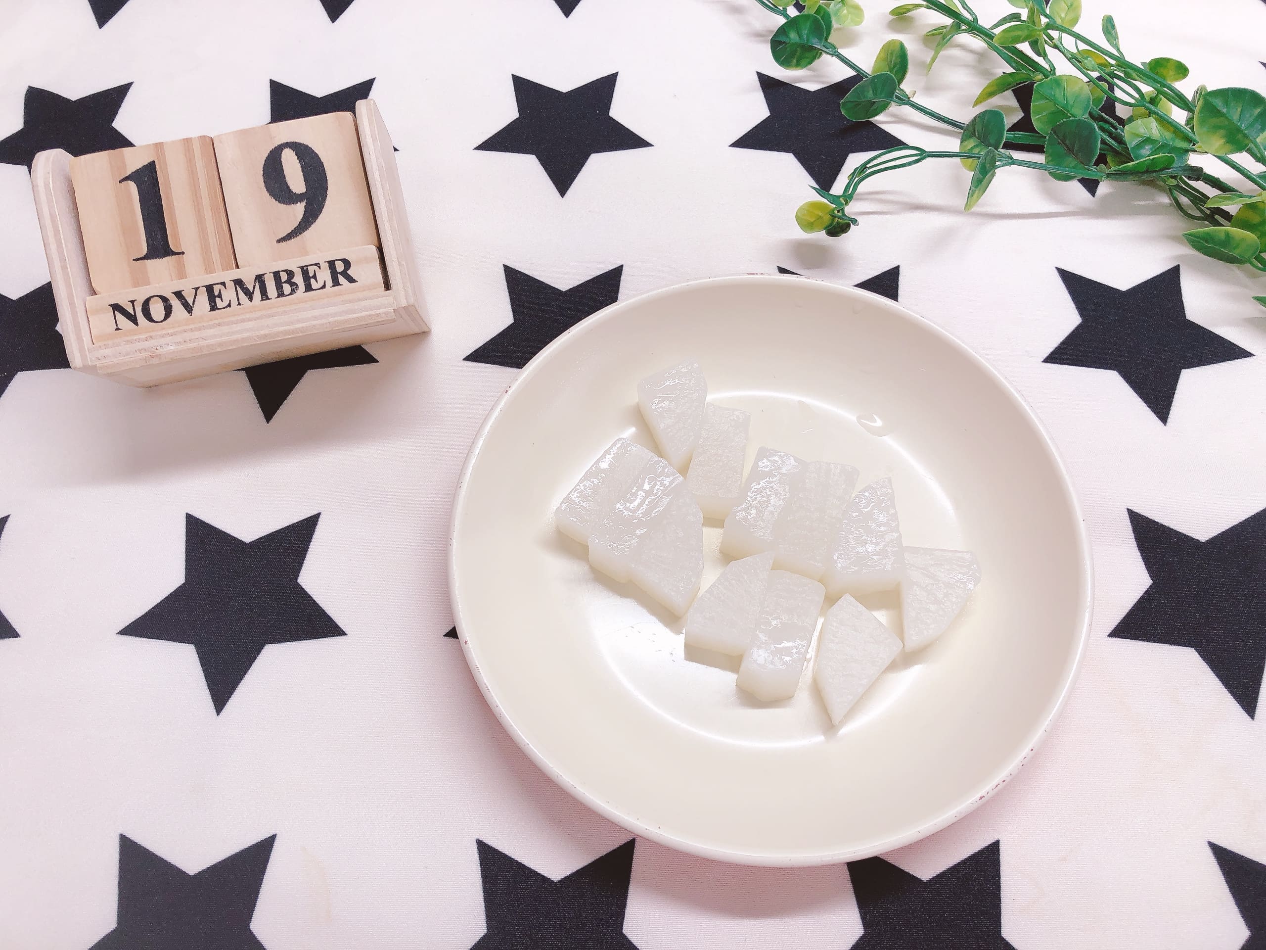 ・りんごは丸かじりすると詰まる恐れがあるため、皮をむいて薄切りにし、煮て柔らかく仕上げました。