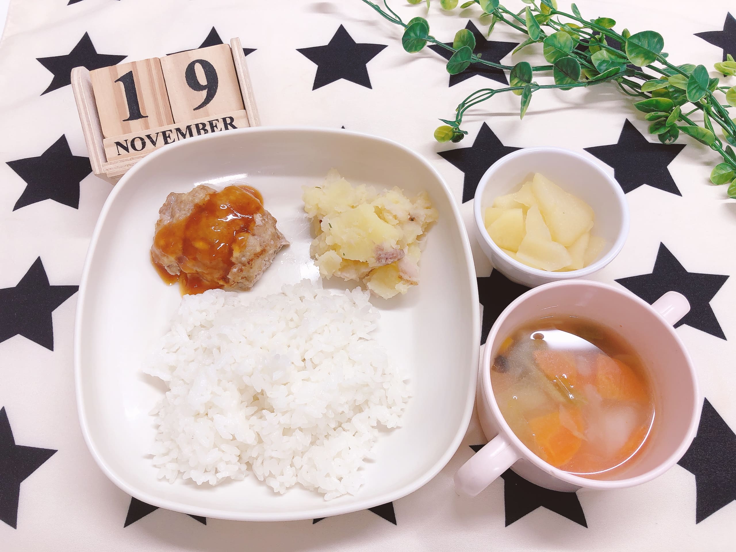 【メニュー名】ご飯、コンソメスープ(人参・きのこ・キャベツ入り)、ハンバーグ、ジャーマンポテト、りんご