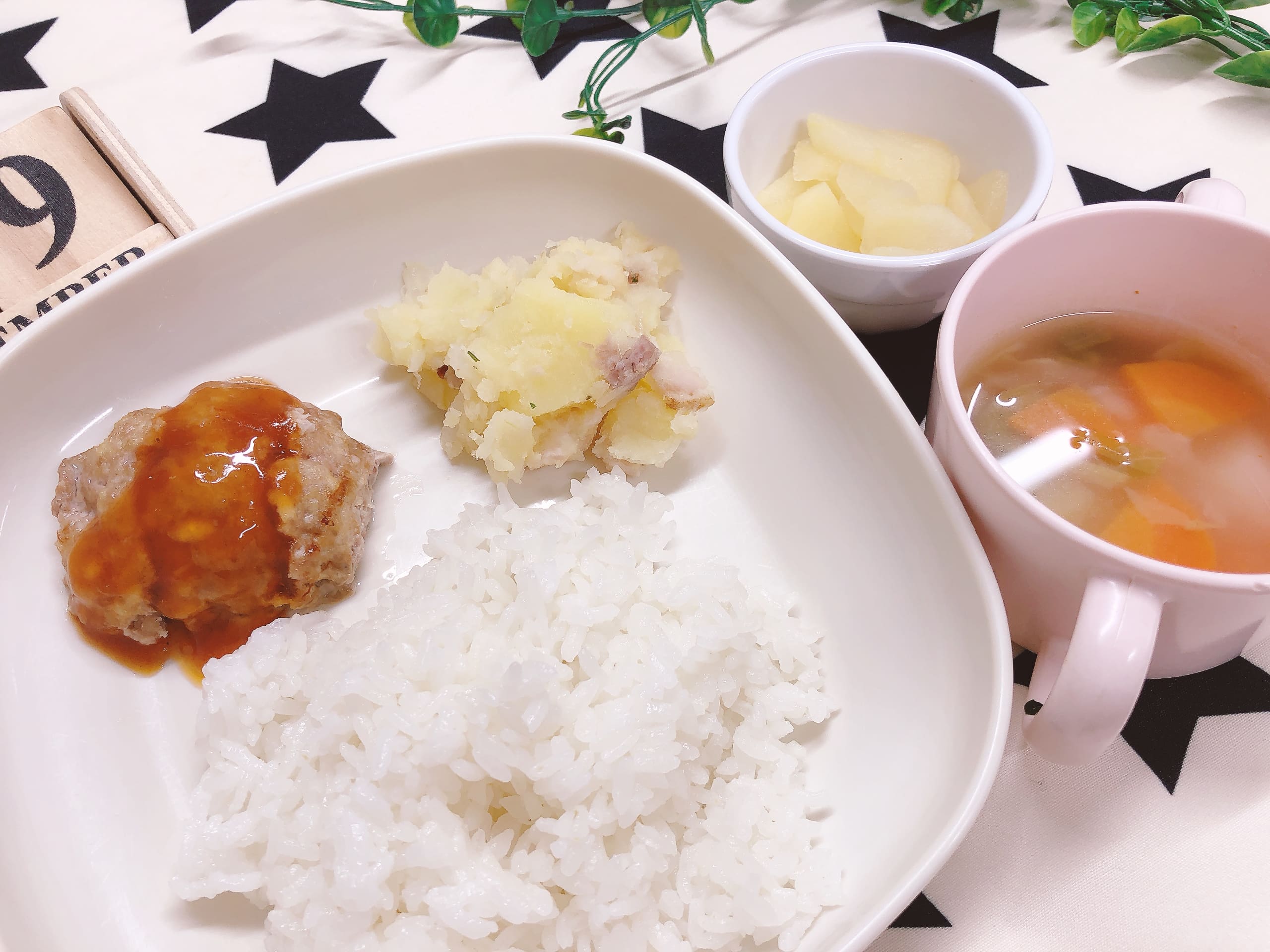 【メニュー名】ご飯、コンソメスープ(人参・きのこ・キャベツ入り)、ハンバーグ、ジャーマンポテト、りんご