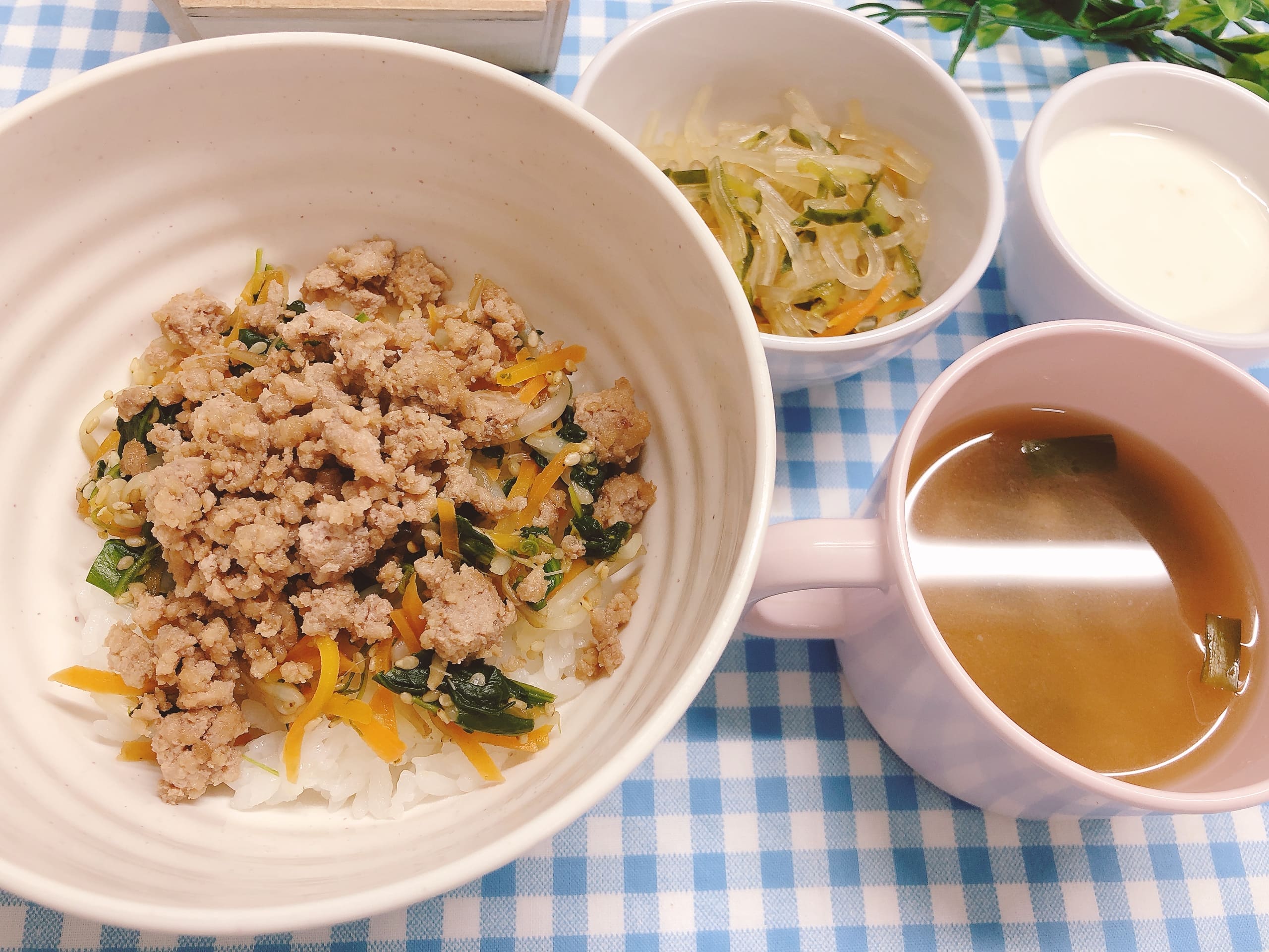 ビビンバ丼の彩りは、ほうれん草・にんじん・もやしをそれぞれナムルにしてからご飯にトッピング。豚ひき肉はしょうゆ・砂糖・みりんの甘辛いタレでしっかり味付けし、温かいご飯とよくなじむように仕上げました。
