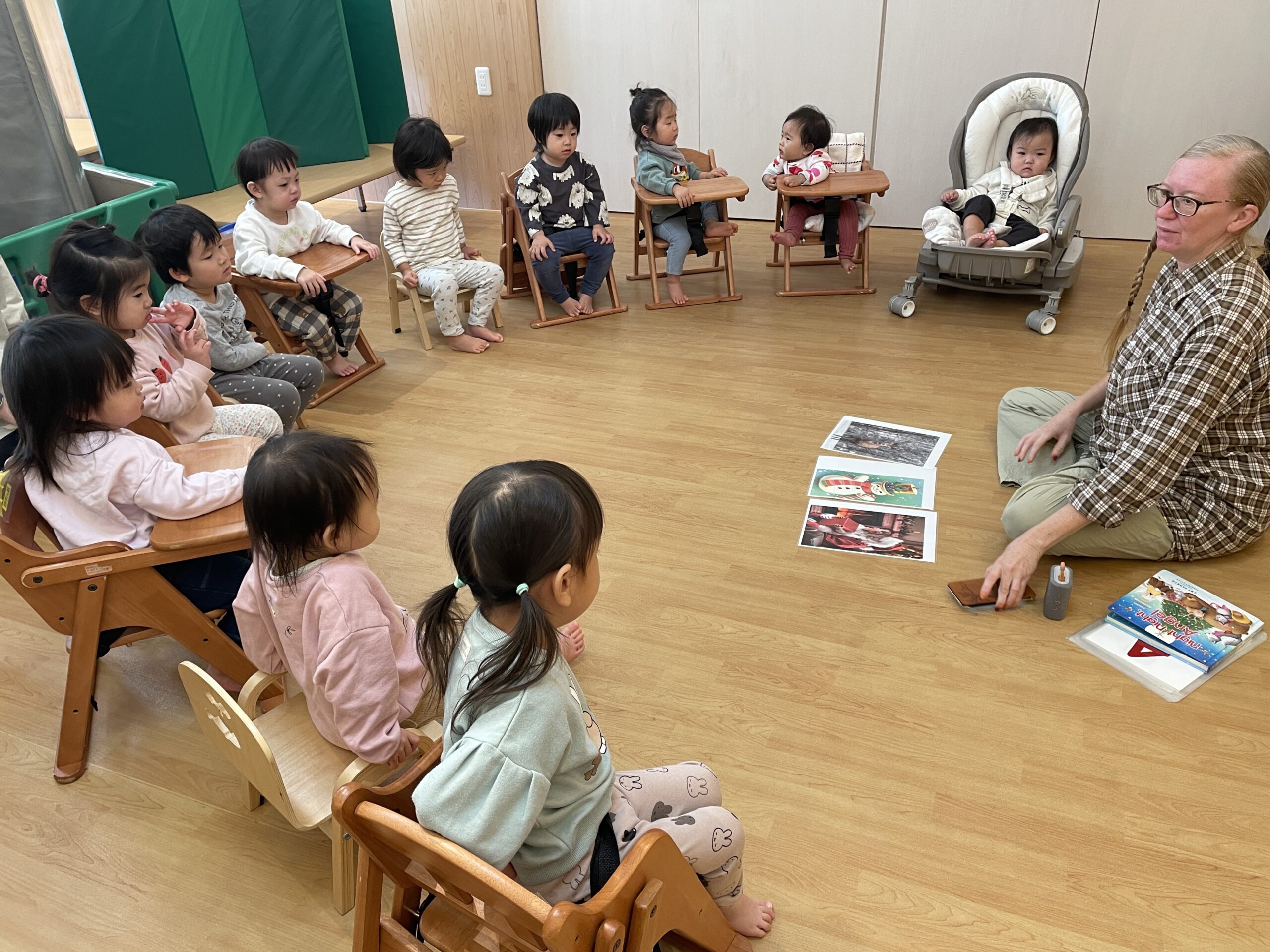 今日は保育室で英語の時間。クリスマスの歌に合わせて、先生が「Jingle, jingle!」と手を振ると、2歳さんが「ジングル!」、1歳さんが「リンリン!」と元気にまねっこ。
