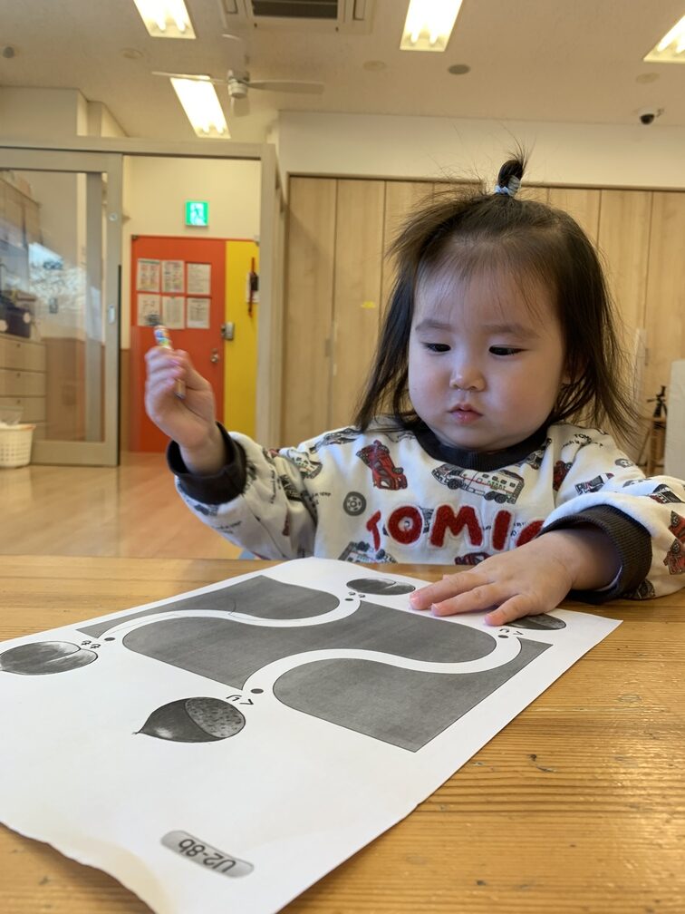 一方、大きいお友だち(2歳児クラス)は、室内でワークをして遊びました。
