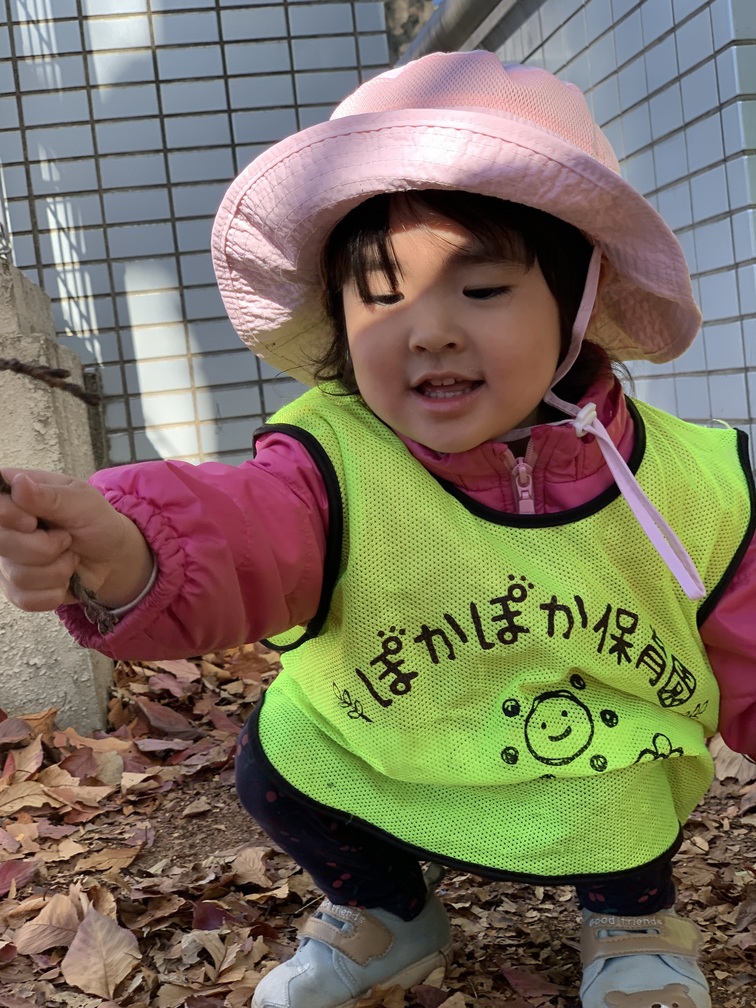 子どもたちは、どこからか拾ってきた落ち葉を高いところからヒラヒラと落として、「きれいだね!」と、落ち葉が舞い落ちる様子をじっと眺めていました。