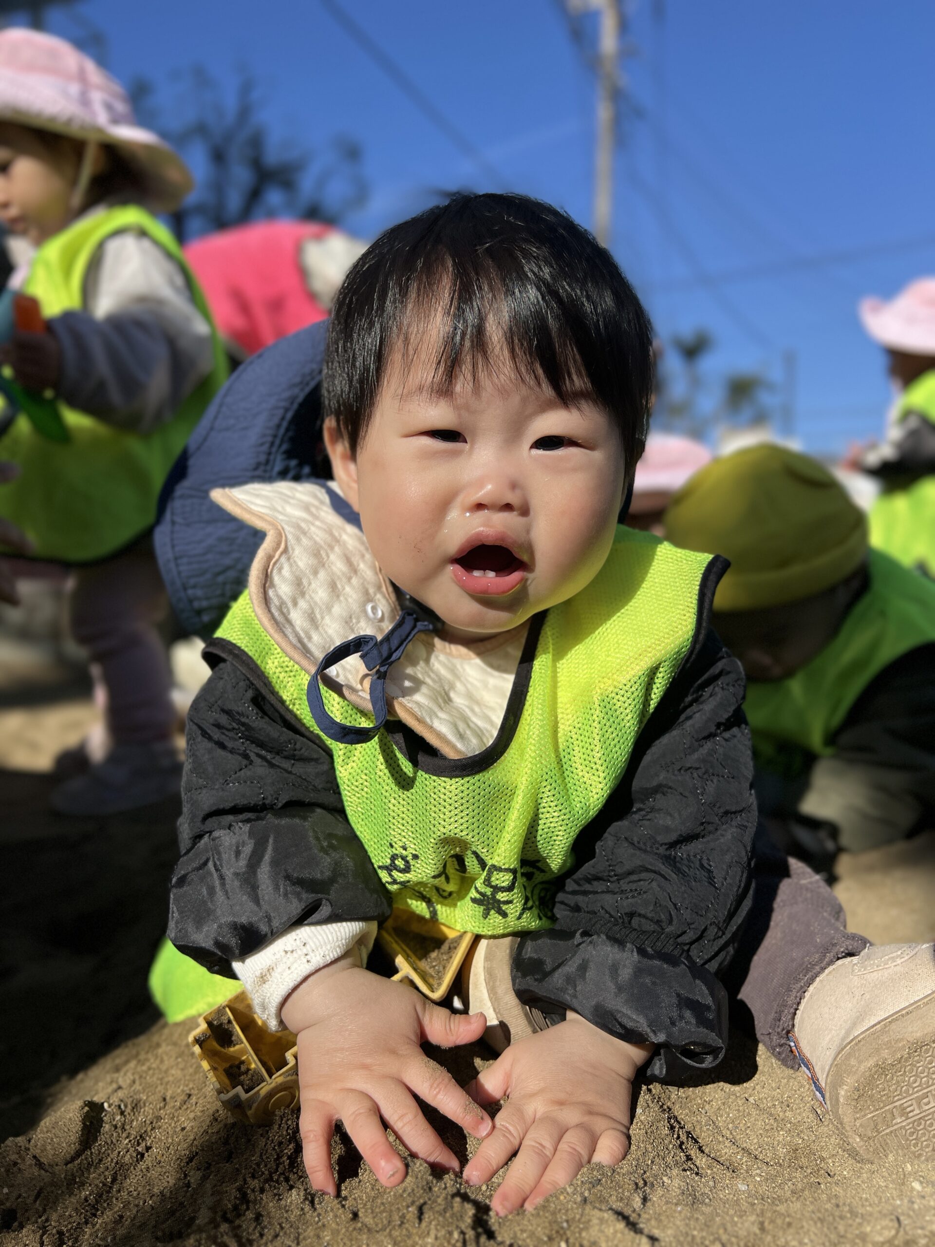 0歳児さんも、サラサラとした砂の感触を指で確かめたり、おもちゃのシャベルでチョンチョンとつついてみたりと、夢中になっていました。