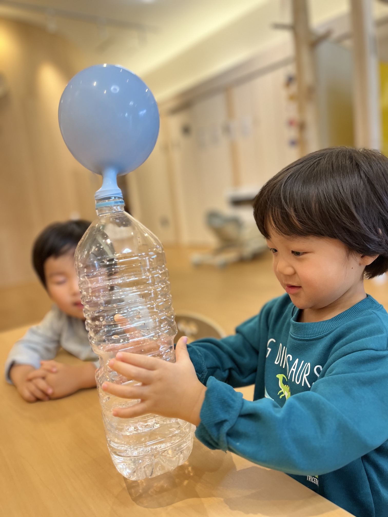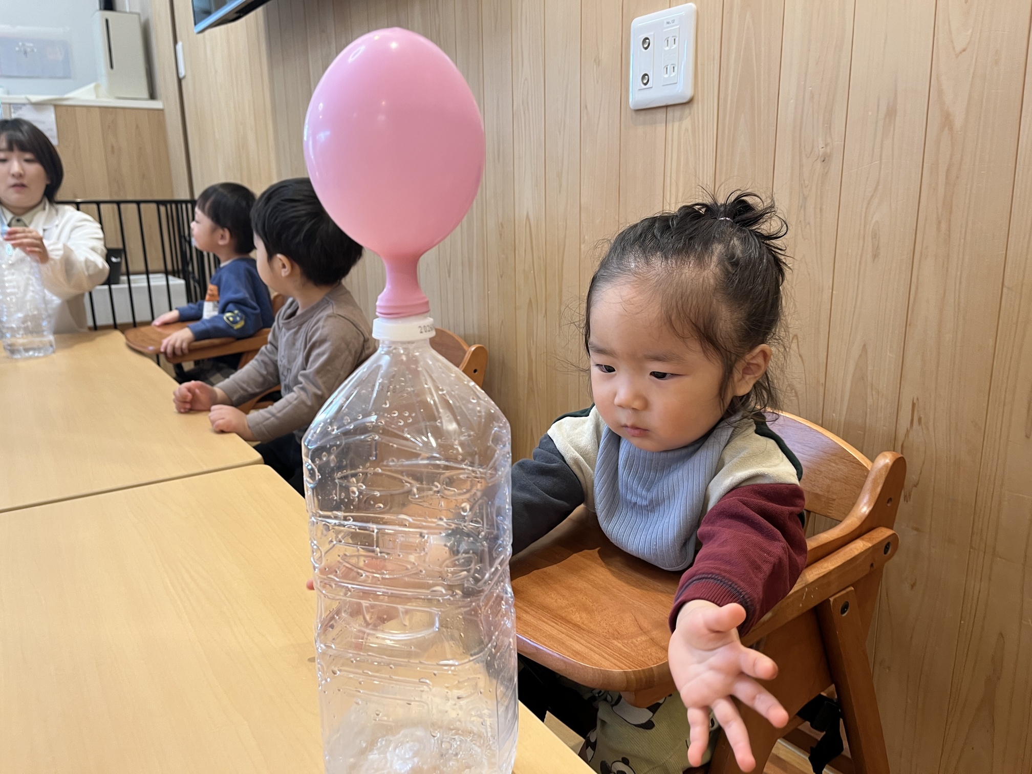 じっと見つめていた子ども達からは「わあぁぁぁ!!」の大歓声!「風船が大きくなった!」と変化にすぐ気づく姿が印象的でした。