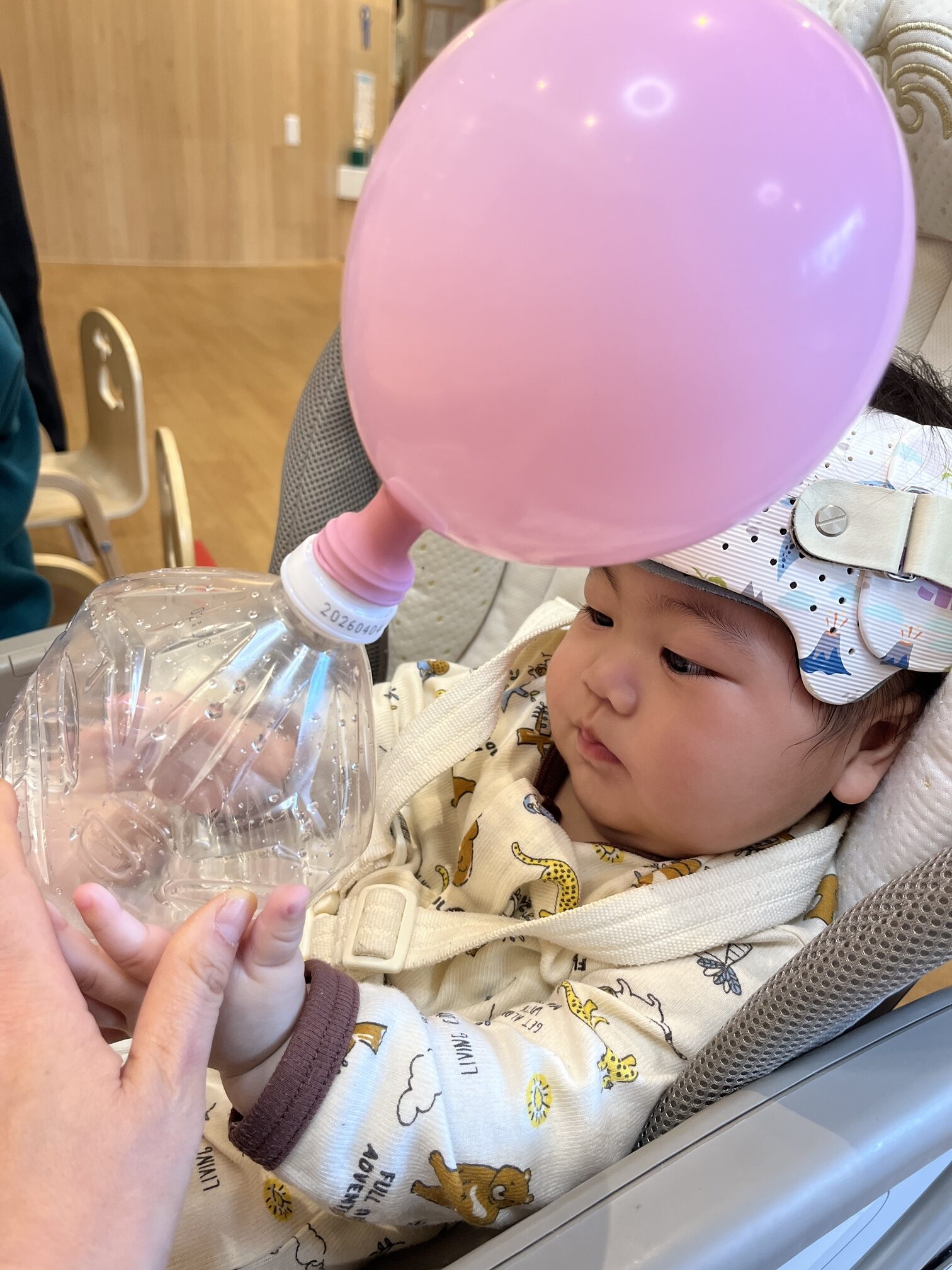 「そーっとさわってみる?」と膨らんだ風船を持っていくと0歳児さんも、にっこりして指でつんつん。見て・触れて楽しむ、乳児にも安心のサイエンス体験になりました。