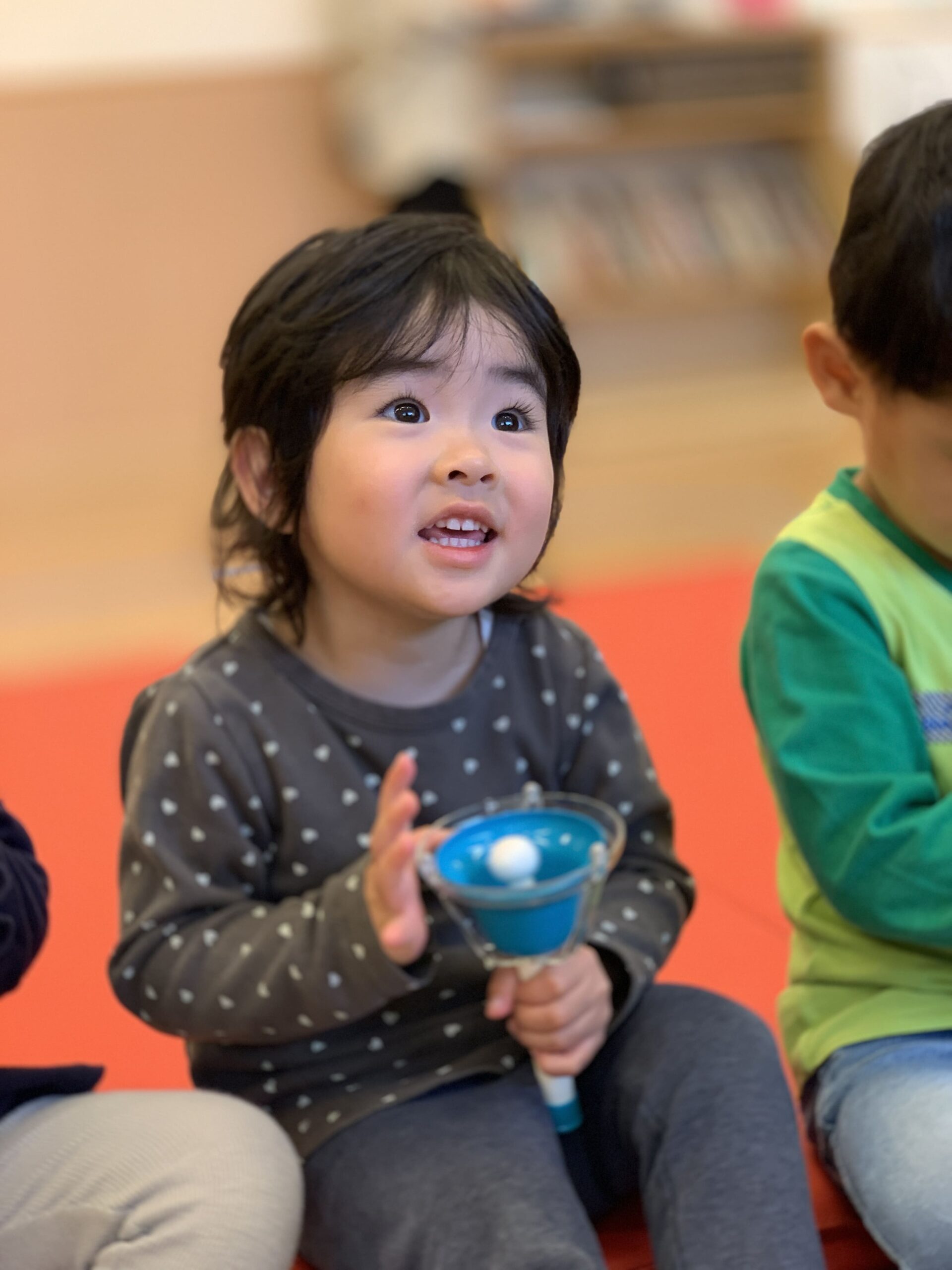 腕に付けて動かすたびに「リンリン♪」と良い音色が響き渡ると、0歳児さんも手を伸ばして音のする方を見つめていました。