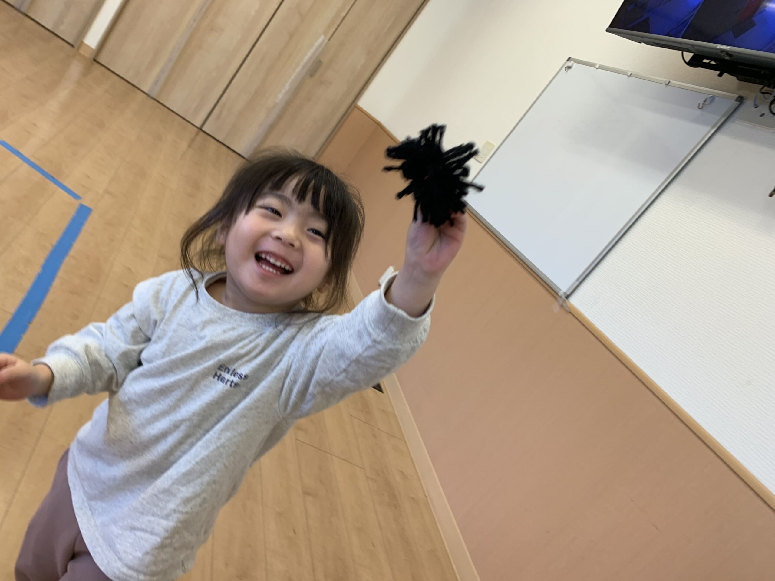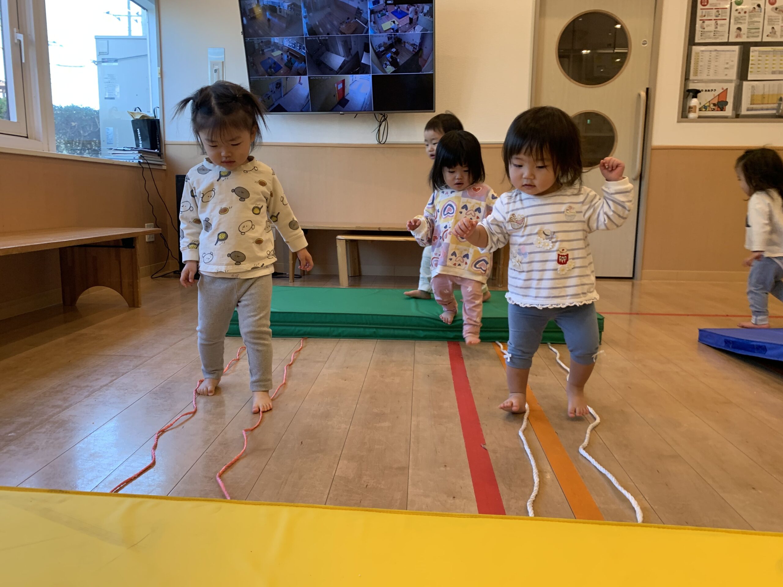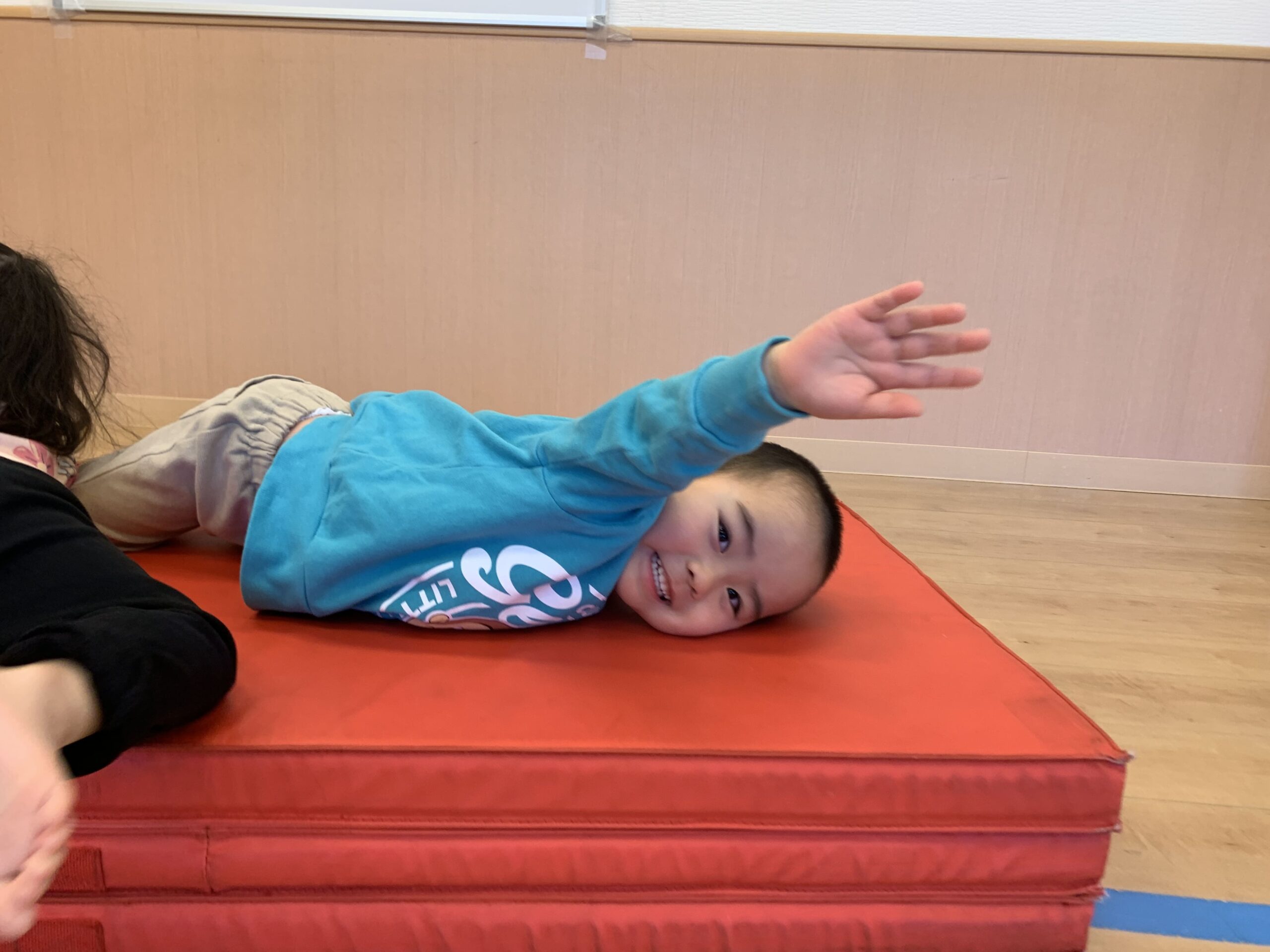 さて、今日は風が強かったため、午前中は保育室の中で元気いっぱいに体育遊びをしました。