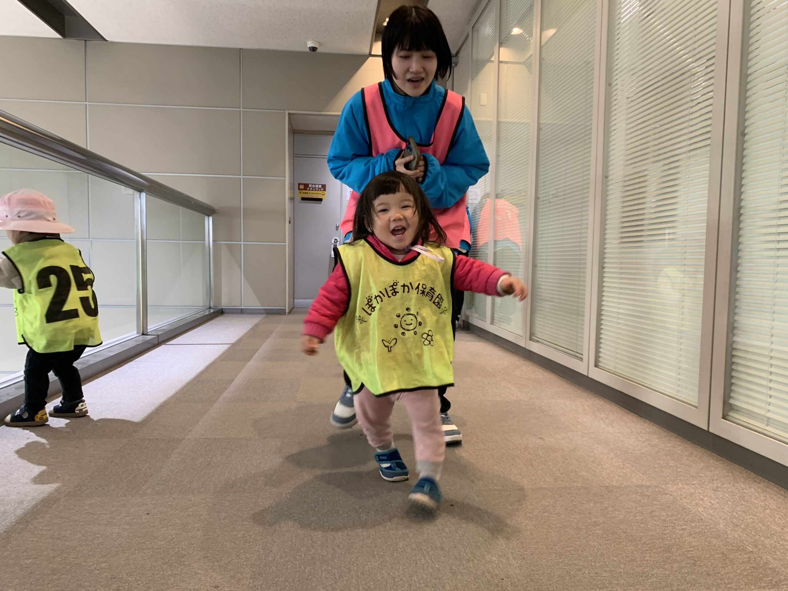 広い通路では先生との追いかけっこが始まりました!「まてまてー!」と先生が追いかけると、子どもたちはきゃっきゃと笑いながら逃げていきます。