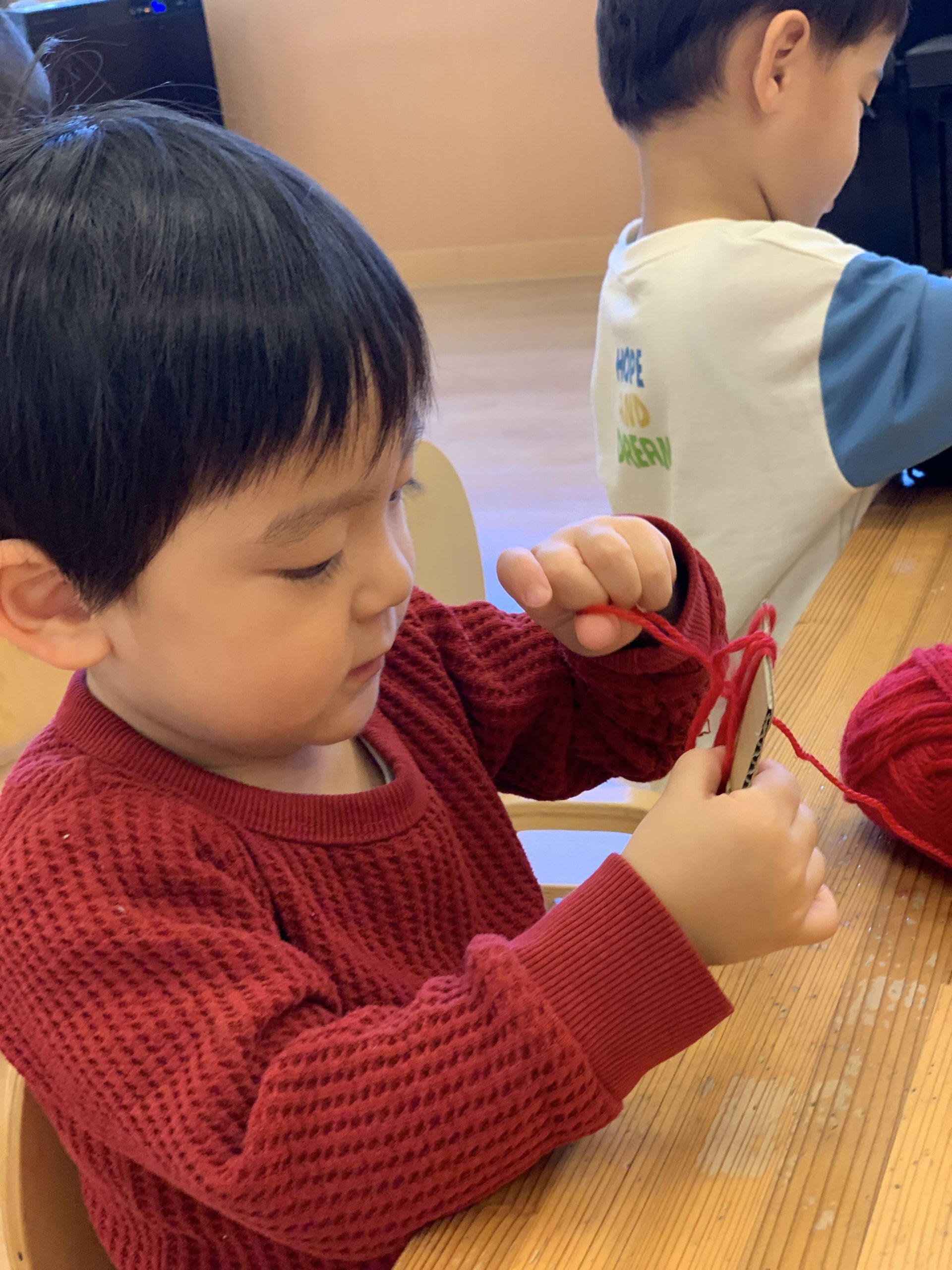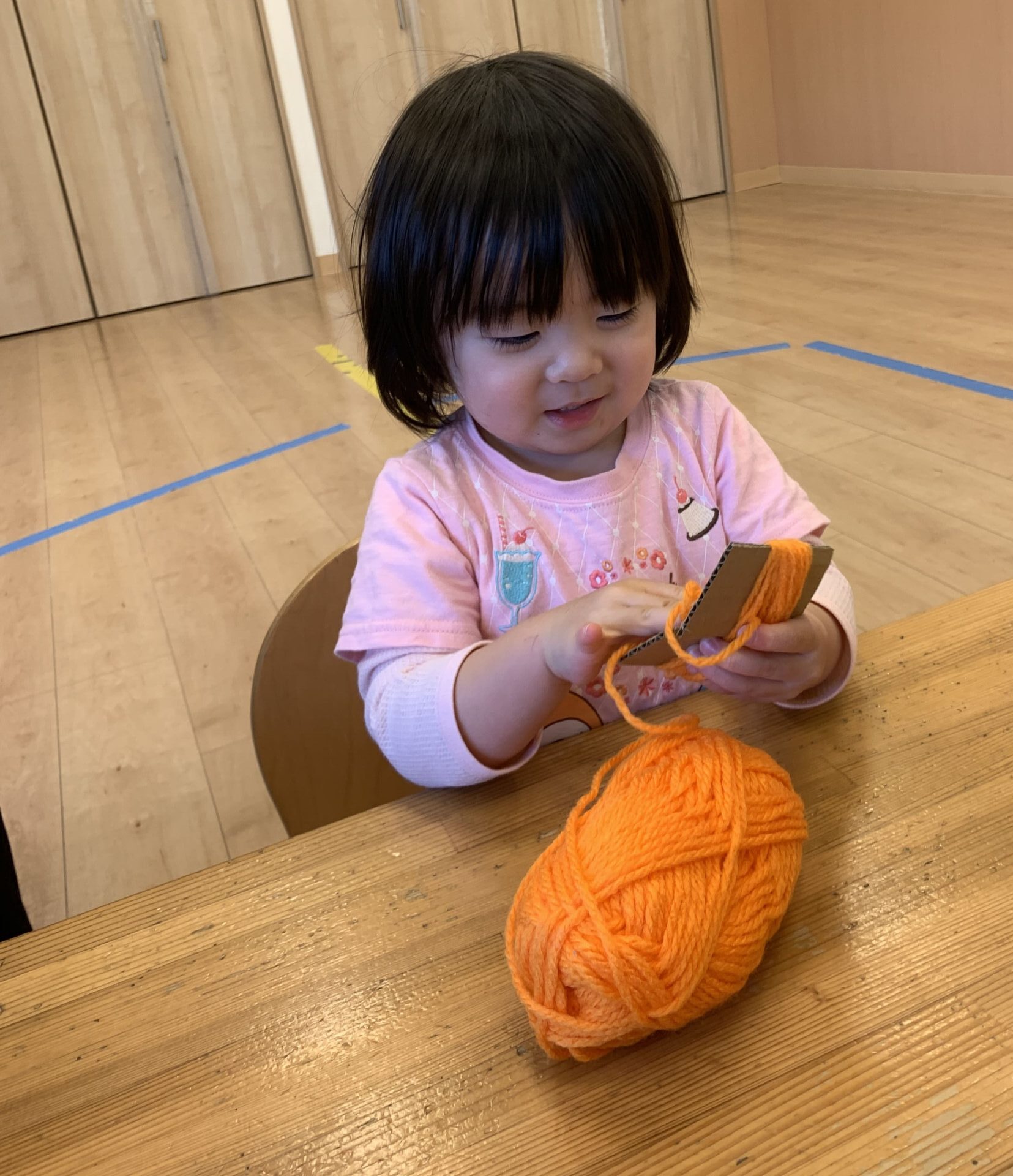 「できた!見て!」と、毛糸がいっぱい巻かれた段ボールを嬉しそうに見せてくれます。