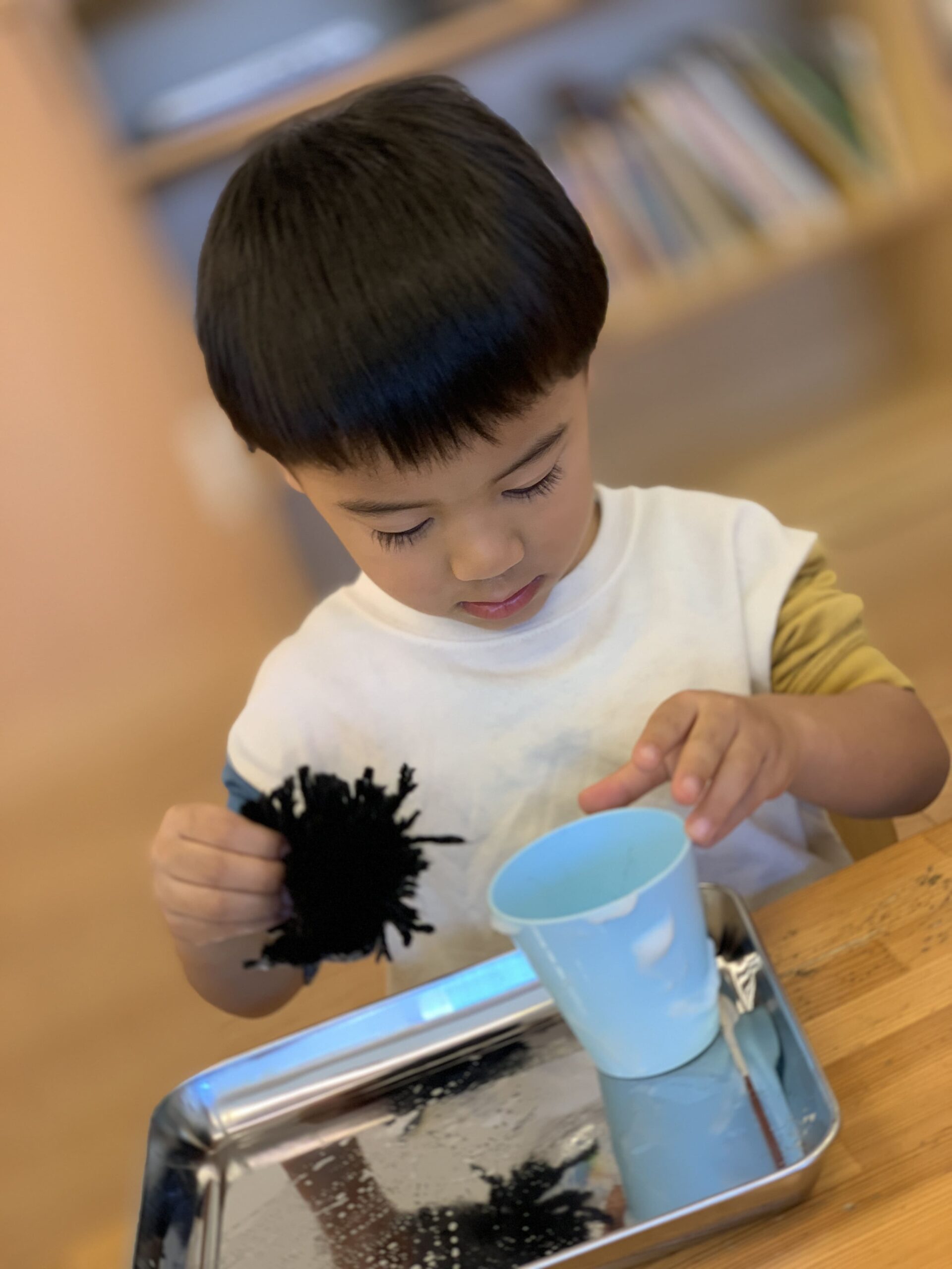 次に、このポンポンに水と石鹸を付けてみる実験です。
