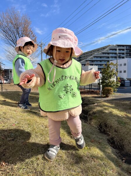 広場には小さな山があり、1歳さんは上り下りに夢中。山の上から「せんせい、みてて~~!」の声に先生が「いいよ、いってみよう!」と見守ると、ものすごい勢いで山を下って「わあー!」と笑いが弾けます♡スピード感がたまらなく楽しいようです☆彡