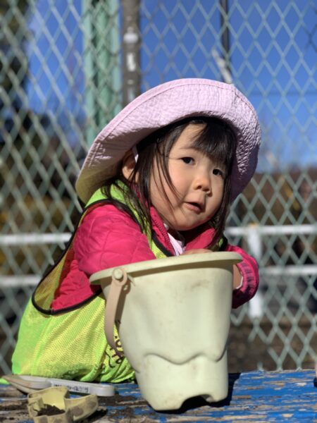 また、別の子どもたちは、スコップで土を入れたり、お砂を混ぜたりして、ダイナミックなお砂場遊びに夢中です!