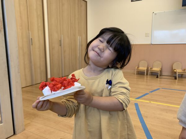 「わー!美味しそうにできたね!」「可愛くできた!」など、たくさんの楽しそうな声が保育室に響き渡りました。