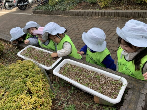 保育園の敷地内にあるプランターで育てているほうれん草をみんなで観察です。