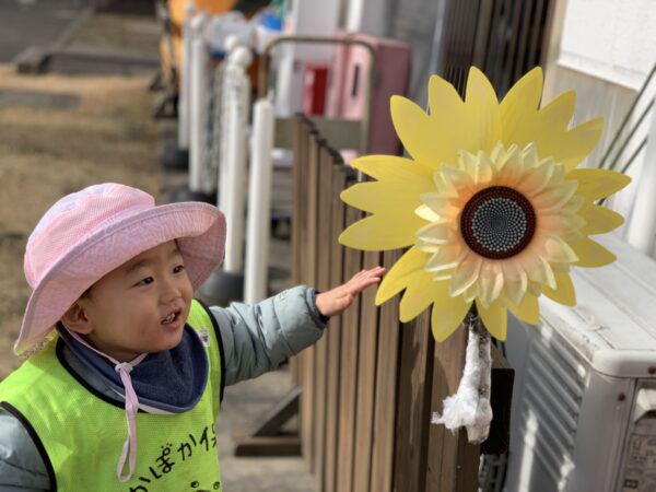公園の片隅に風車を見つけると、「あ!」と指をさして、じーっと見つめる子どもたち。