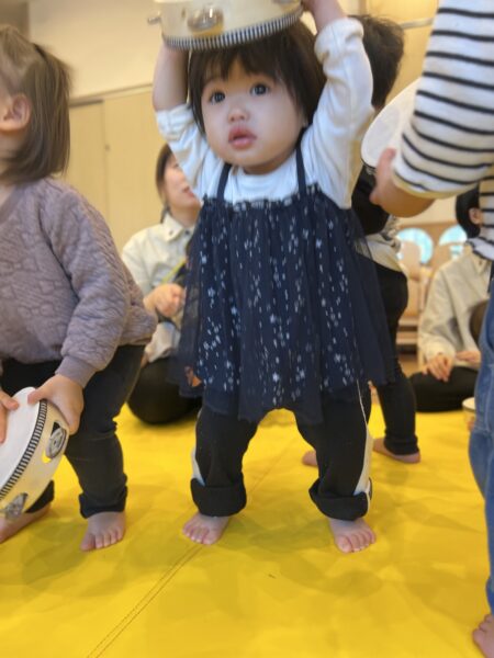 タンブリンを臼に見立てて、スカーフのお餅で餅つきもしました。